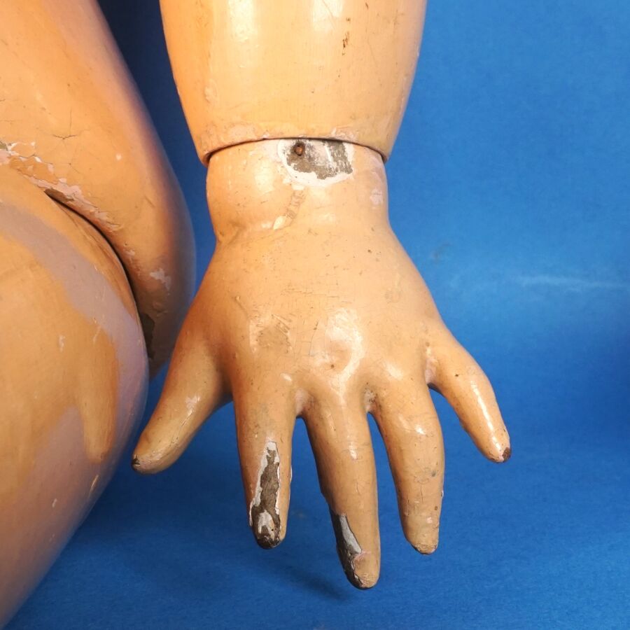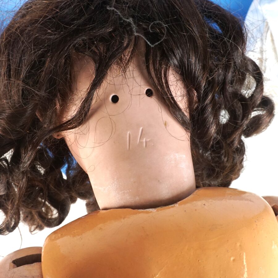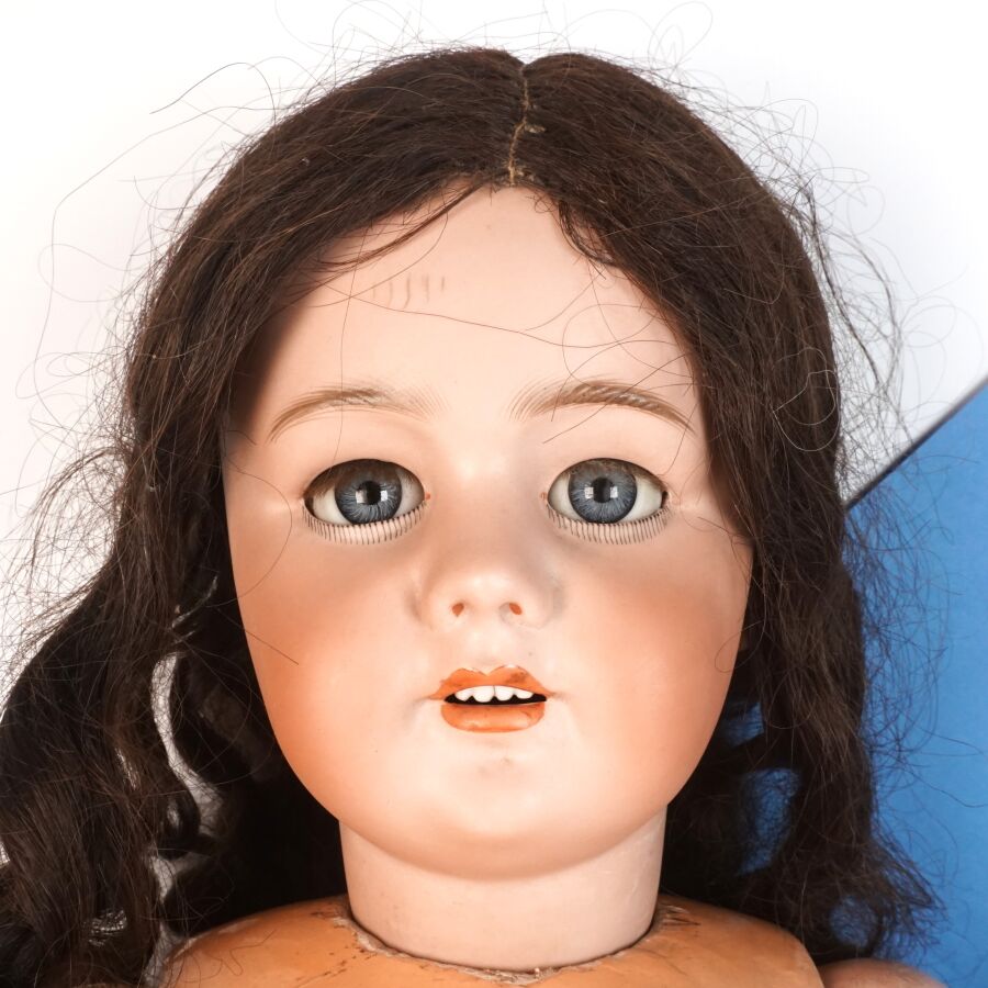 D.E.P. : Poupée tête porcelaine bouche ouverte, dents apparentes, yeux à bascule, corps articulé, présentée avec quelques vêtements, L. 80 cm (usures).