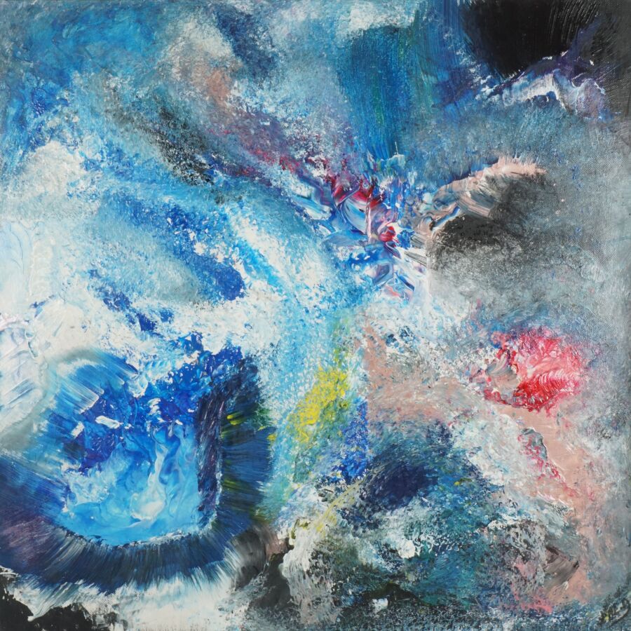 D. LAE (XXe), "Énergie primordiale", acrylique sur toile, signée en bas à droite, 60 x 60 cm.