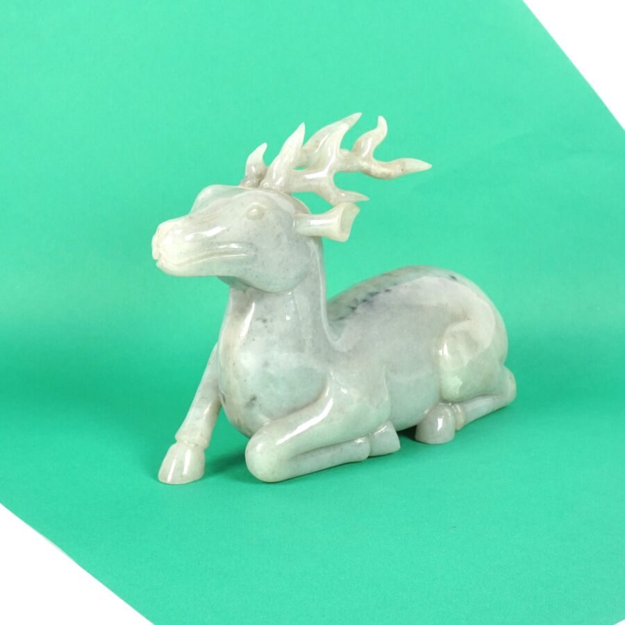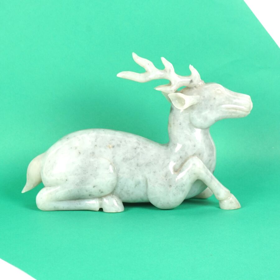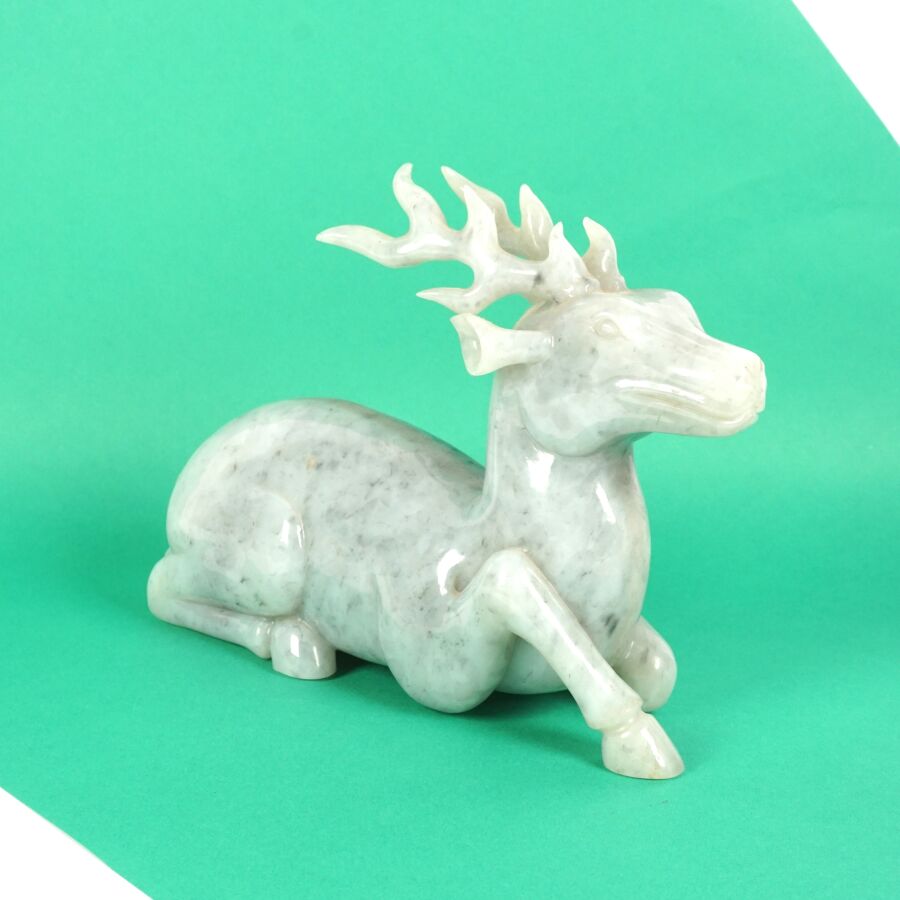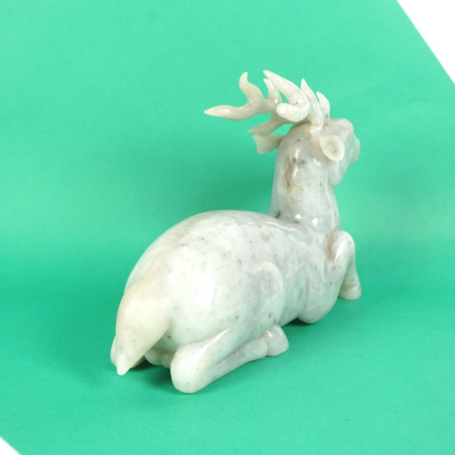 Daim au repos, important sujet sculpté en jadéite de Birmanie de couleur céladon, présenté sur son socle en bois sculpté, Chine, circa 1920, L. 26 cm.