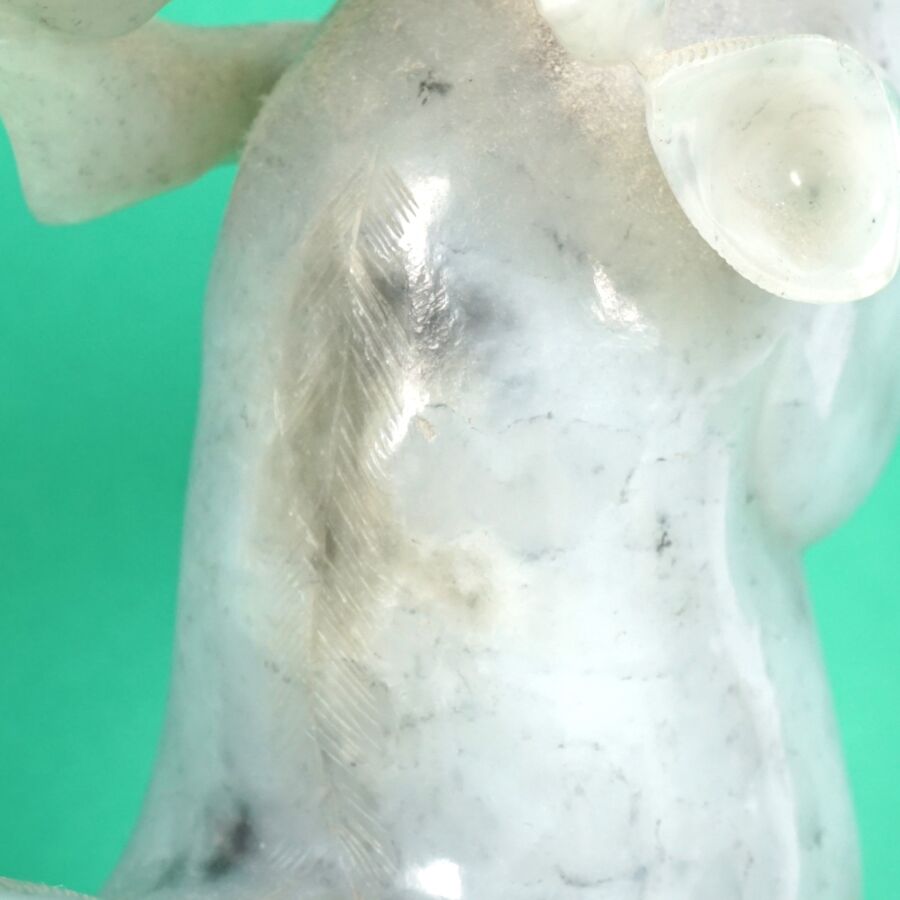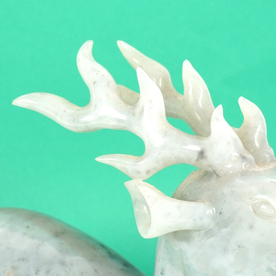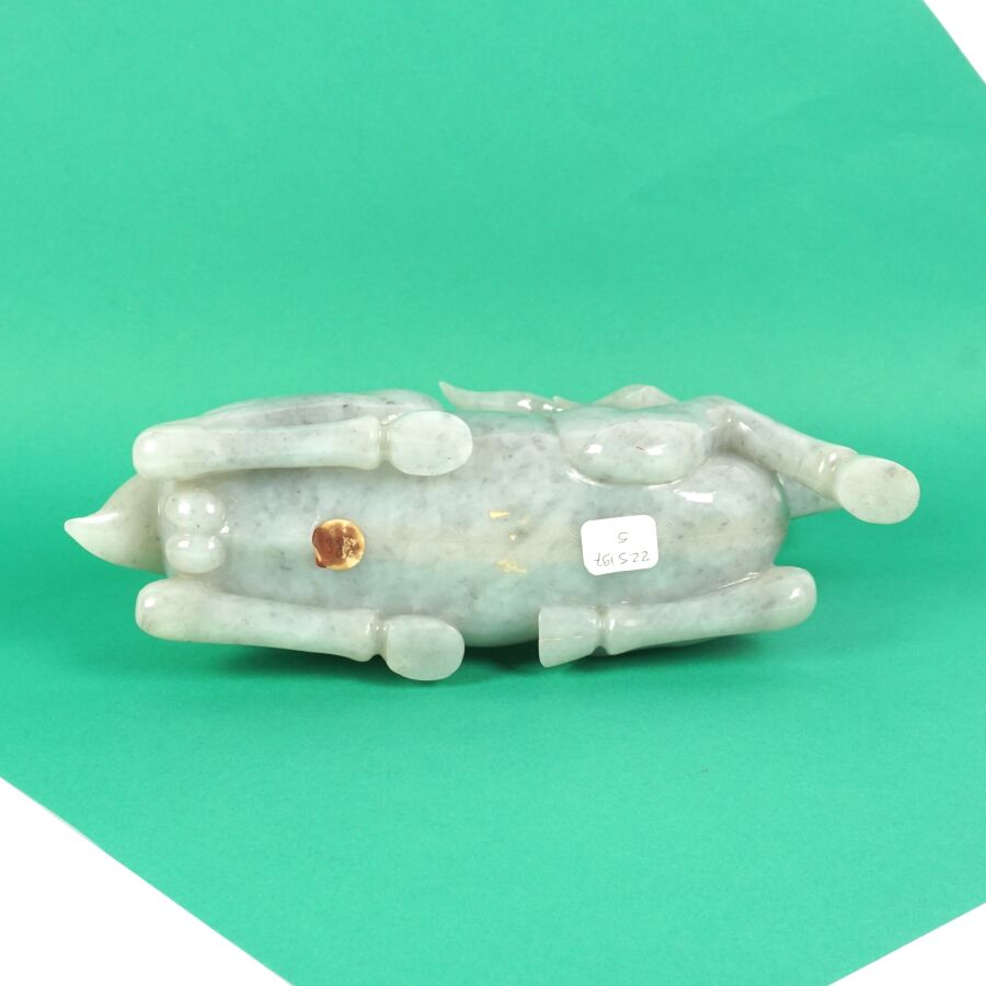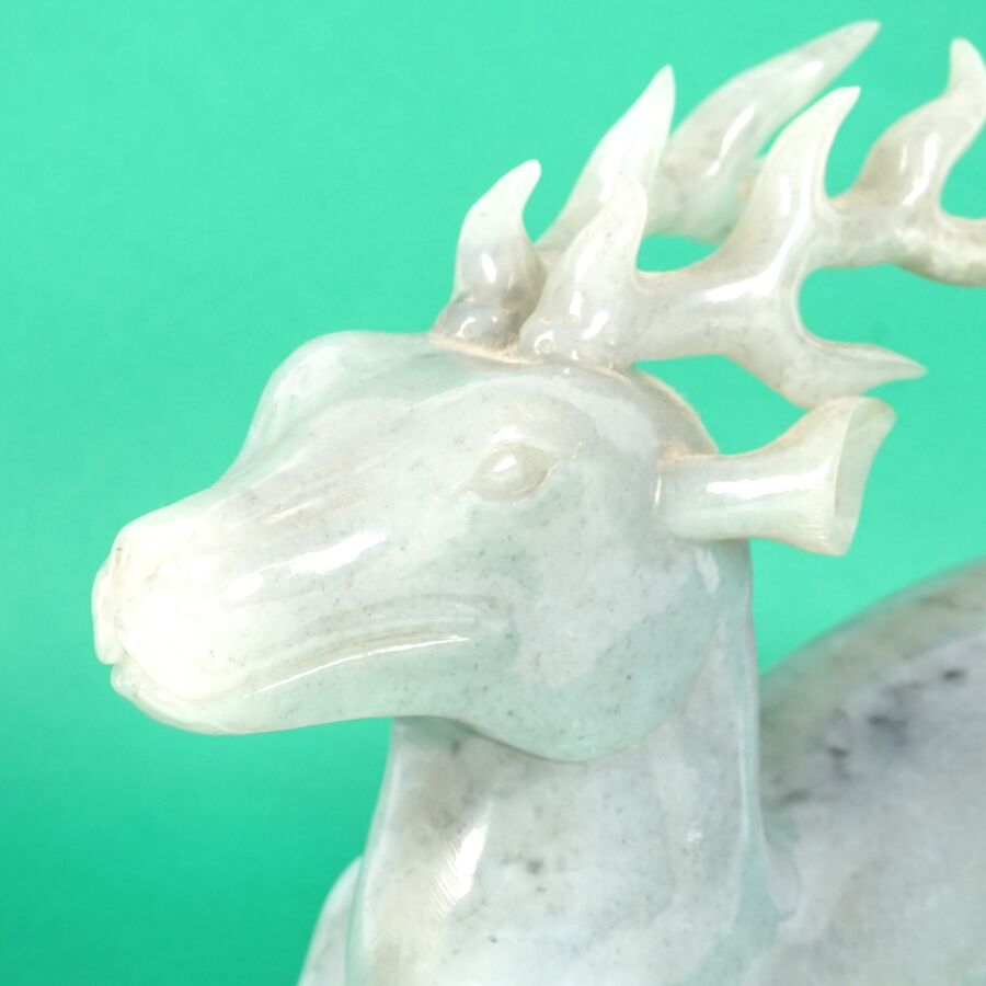 Daim au repos, important sujet sculpté en jadéite de Birmanie de couleur céladon, présenté sur son socle en bois sculpté, Chine, circa 1920, L. 26 cm.