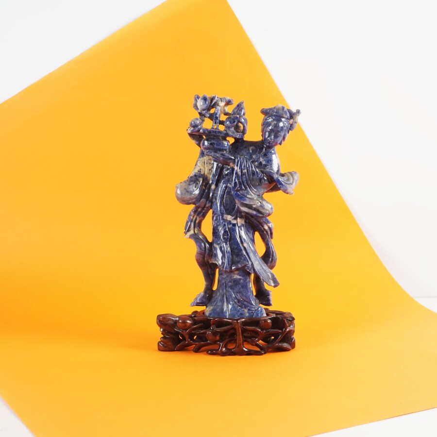 Dame de cour tenant une fleur, groupe en pierre dure bleue sculptée imitant le lapis-lazuli, Chine, 20e siècle, H. 18 cm (manques, sur son socle en bois).