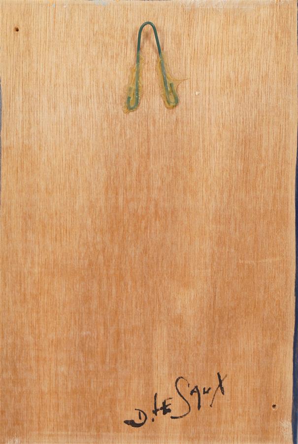 Daniel LE SAUX (XX-XXIe), "Caricature de pêcheur", composition sous verre, signée au dos, 24 cm x 16 cm.