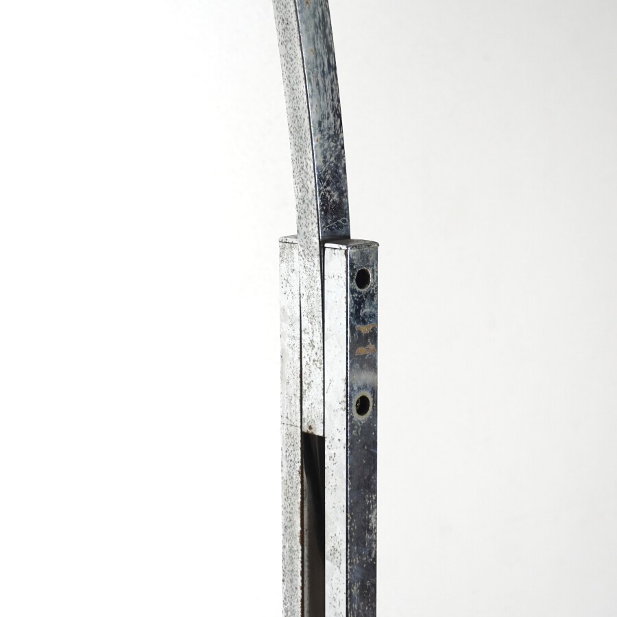 Dans le goût de Achille (1918-2002) et Pier Giacomo (1913-1968) CASTIGLIONI : Lampadaire "Arc", structure en métal chromé, piètement en travertin, travail italien circa 1970, H. 230 cm (piqures, oxydations, abat-jour à refixer).