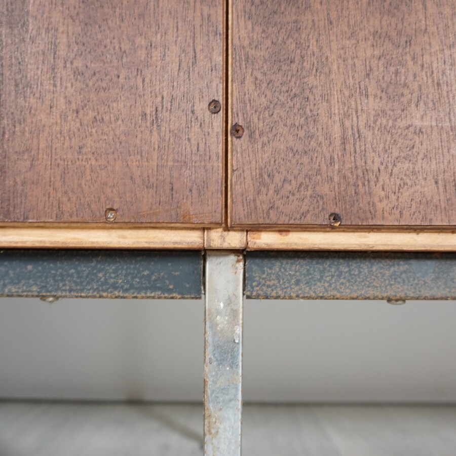 Dans le goût de Alain RICHARD (1926-2017) : Enfilade de style moderniste en placage de wenge à corps rectangulaire ouvrant en façade à un abattant, quatre tiroirs au centre, et 2 portes, le piètement composé de 6 pieds de section carrée en métal chromé, travail français des années 1970, marqué "GES, ste SGBG" sur l'un des montants métalliques intérieurs, H. 75 cm, L. 265 cm, P. 46.5 cm (usures et oxydations au piétement, quelques rayures).