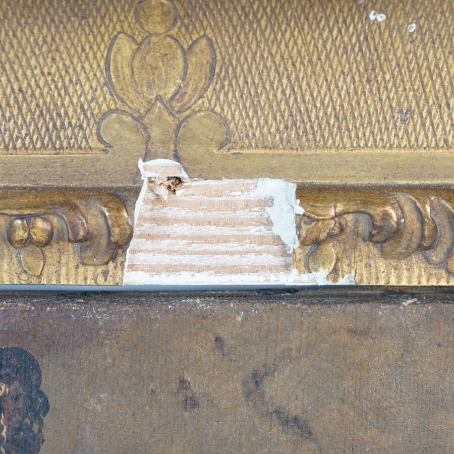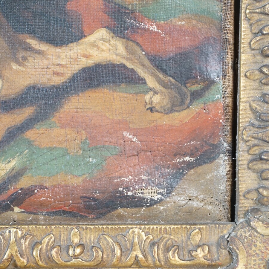 Dans le goût de Alfred de DREUX (1810-1860), "Chiens attaquant un chat", huile sur toile d'origine non signée, 32 x 45 cm (accidents et manques).