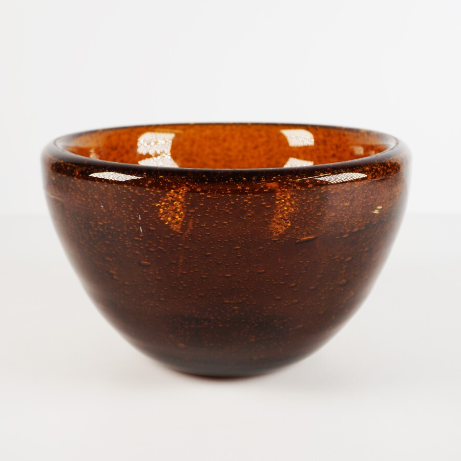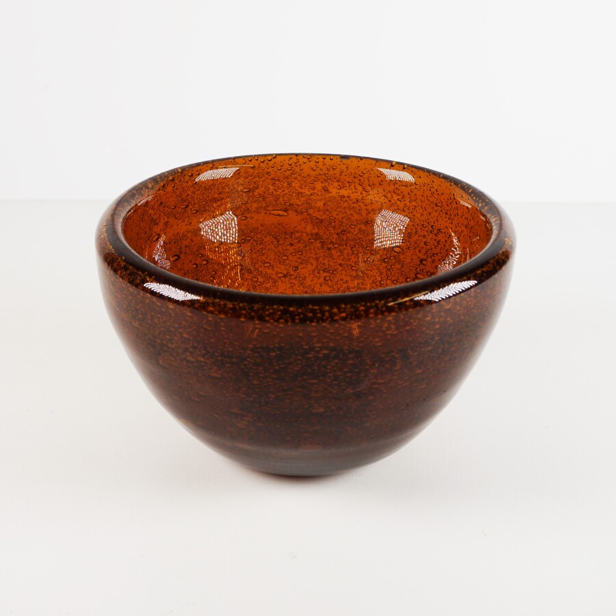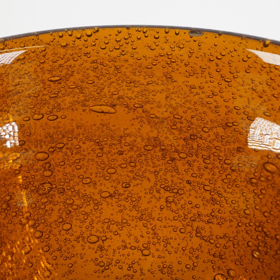 Dans le goût de BIOT : Cache-pot en verre bullé teinté marron, H. 12 cm. Diam. 20.5 cm (éclat sous la base).