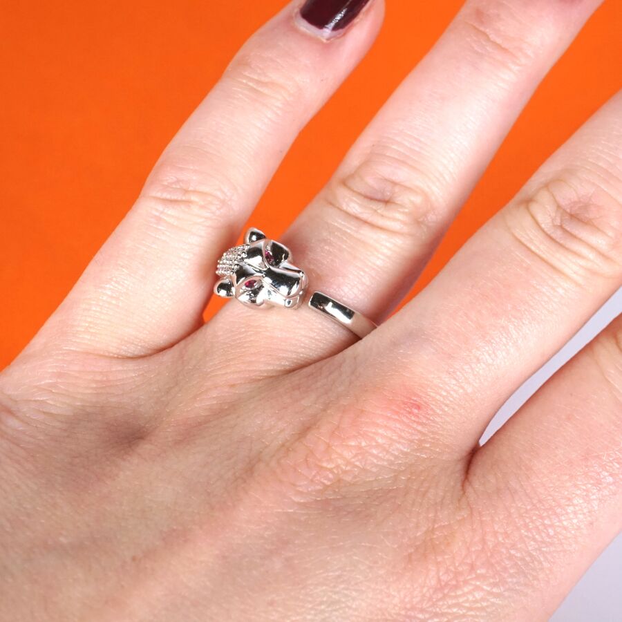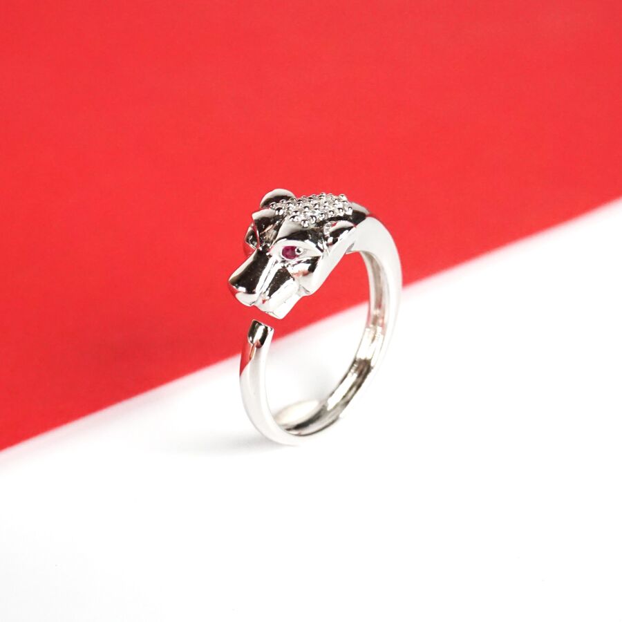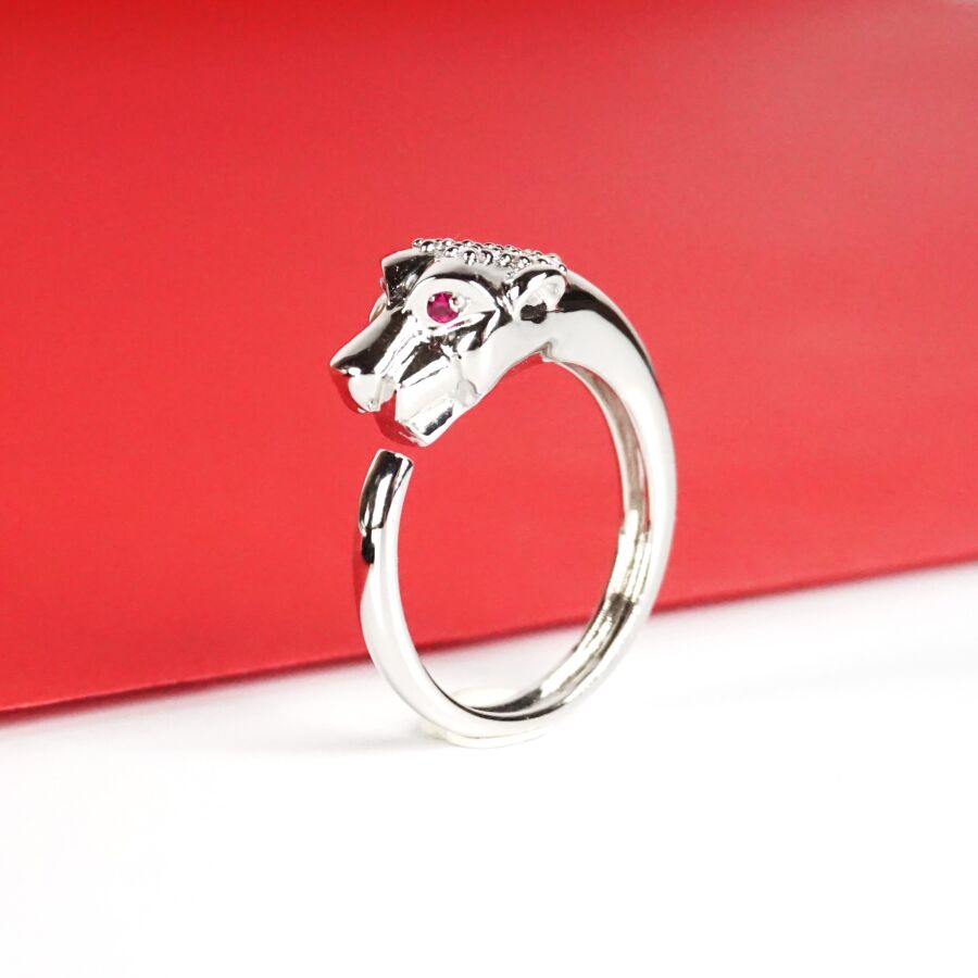 Dans le goût de CARTIER : Bague "Panthère" en or gris 18K (750/oo), les yeux sertis chacun d'un rubis calibrant ensemble 0.10 ct environ, le dessus de la tête sertie de 15 diamants calibrant au total 0.10 ct environ, anneau jonc ouvert, TDD. 56. Poids brut : 5.9 g environ.