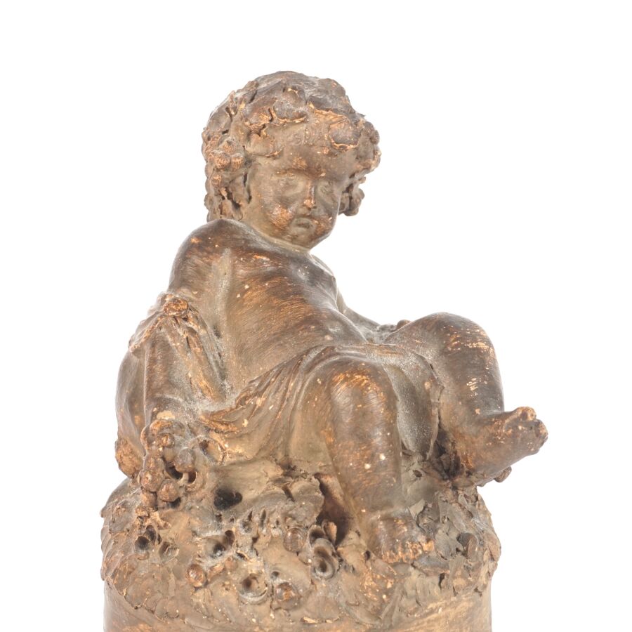 Dans le goût de Claude Michel CLODION (1738-1814), "Bacchus enfant", sujet en terre cuite, signé en creux au revers, H. 10.5 cm (petites usures).
