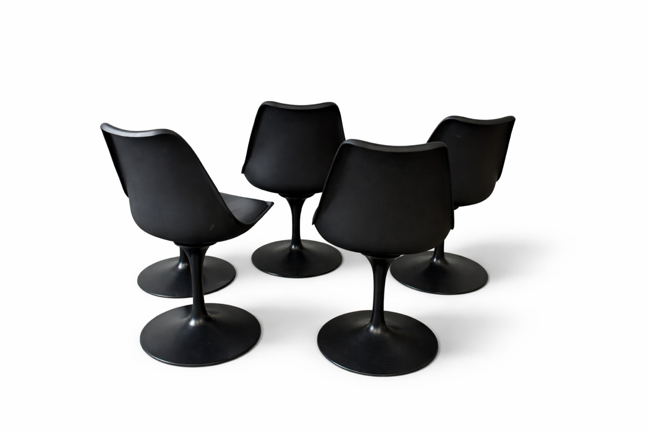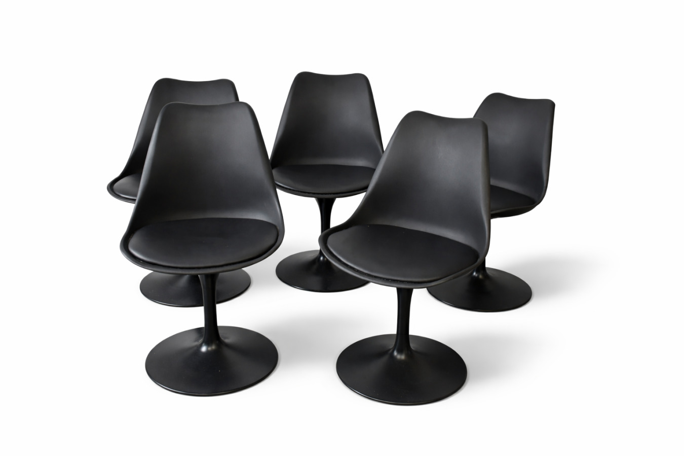 Dans le goût de Eero SAARINEN (1910-1961) : Suite de cinq chaises "Tulipe", coque en plastique moulé noir sur piètement central en tulipe laqué noir, coussin d'assise noir, H. 82 cm, Larg. 47.7 cm, Prof. 41 cm.