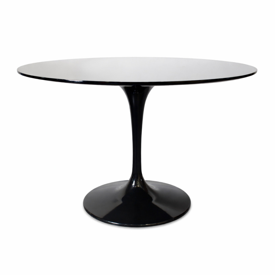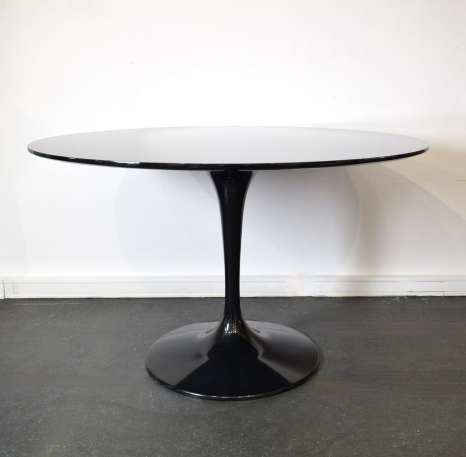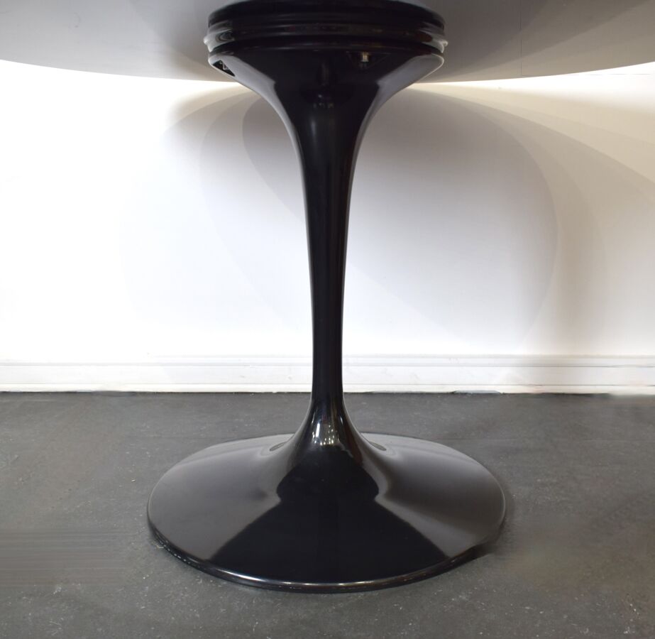 Dans le goût de Eero SAARINEN (1910-1961) : Table "Tulipe" ronde, le plateau en stratifié noir, le pied en métal noir, 75 x 120 cm.