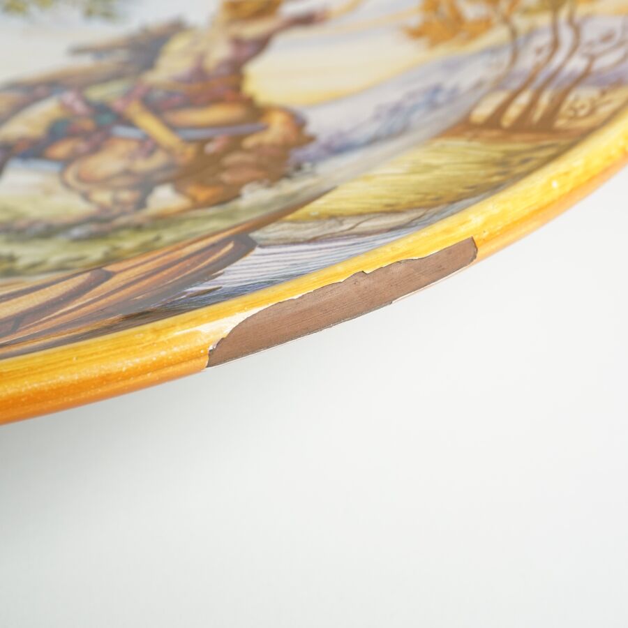 Dans le goût de FAENZA : Important plat circulaire en faïence émaillée polychrome à décor d'une scène mythologique, marquée au dos, 20ème siècle, Diam. 60.5 cm.