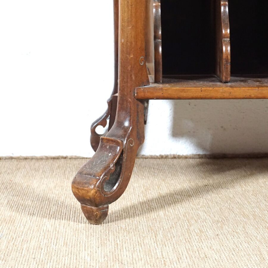 Dans le goût de Gabriel VIARDOT (1830-1906), Meuble deux corps en bois sculpté, partie haute à trois étagères, surmontée d'un gradin à décor feuillagé, la partie basse composée d'étagères et casiers, première moitié du 20ème siècle, Dim. Totale : 158 x 59 x 33 cm (fentes, éléments partie basse à refixer, usures).