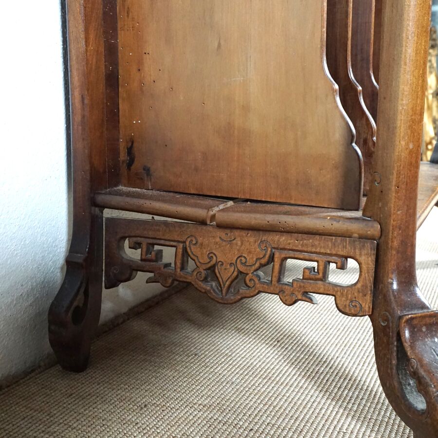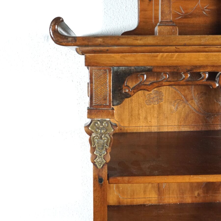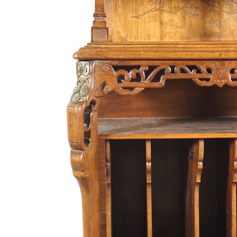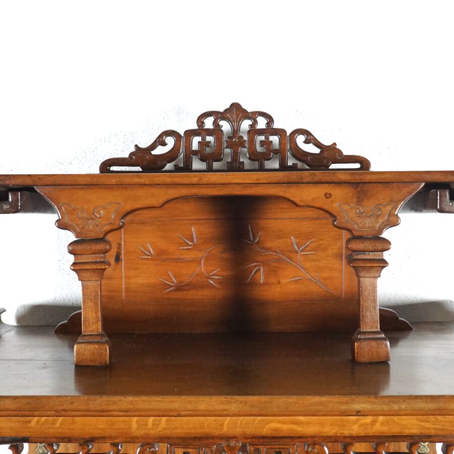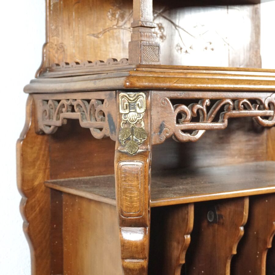 Dans le goût de Gabriel VIARDOT (1830-1906), Meuble deux corps en bois sculpté, partie haute à trois étagères, surmontée d'un gradin à décor feuillagé, la partie basse composée d'étagères et casiers, première moitié du 20ème siècle, Dim. Totale : 158 x 59 x 33 cm (fentes, éléments partie basse à refixer, usures).