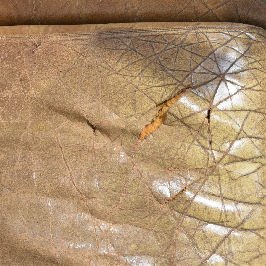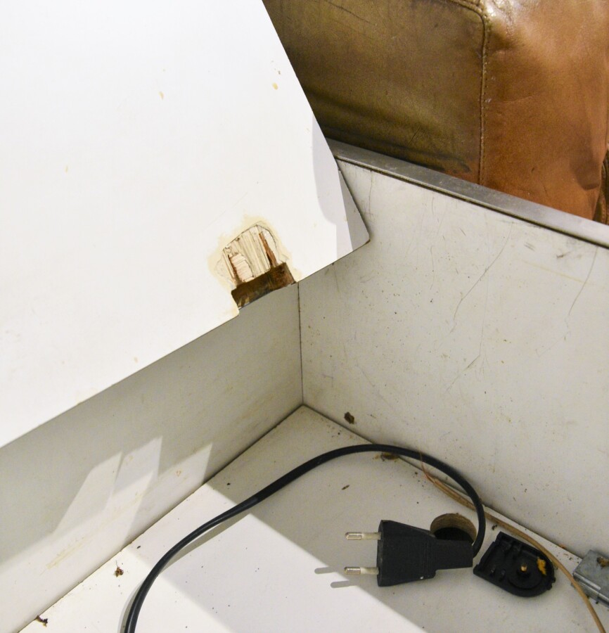 On y joint une jardinière d'angle électrifiée en acier brossé et bois de placage (nombreuses usures et déchirures sur les assises et les accoudoirs, l'acier légèrement rayé et taché).