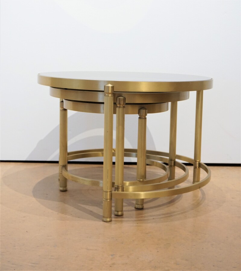 Dans le goût de JANSEN : Table gigogne circulaire à 3 éléments en bronze doré, plateau en verre fumé, H. 28, 31.5 et 35 cm et D.31, 40.5 et 51 cm