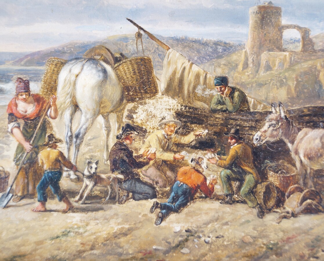 Dans le goût de Jean-Louis DEMARNE (1752/54-1829), "Famille de goémoniers" huile sur toile, 24 x 32.5 cm (manque de peinture au centre de la composition).