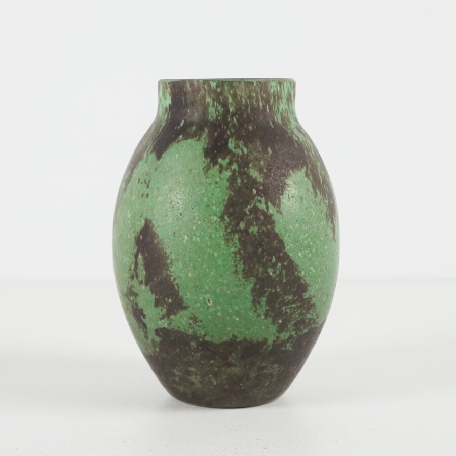 Dans le goût de l'école de NANCY : Petit vase ovoïde en verre dépoli, vert et brun, à décor moucheté, H. 10 cm.