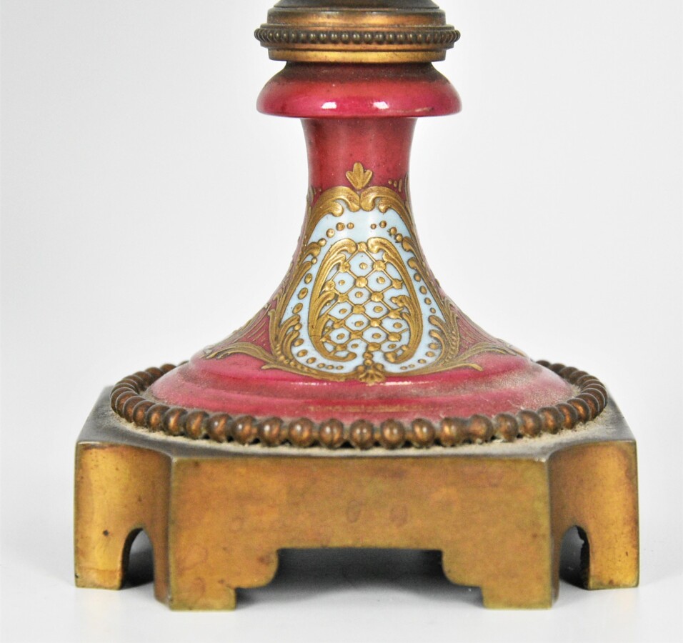 Dans le goût de Limoges : Paire de vases de forme balustre sur piédouche à décor de scènes galantes dans des réserves, rehaussées à l'or à motif de rinceaux et de feuillages, signées Hazel, monture ciselée stylisée en laiton, fin 19e. H. 39 cm.