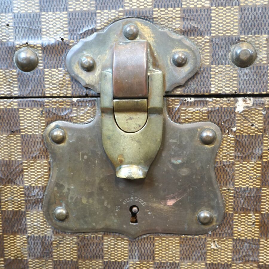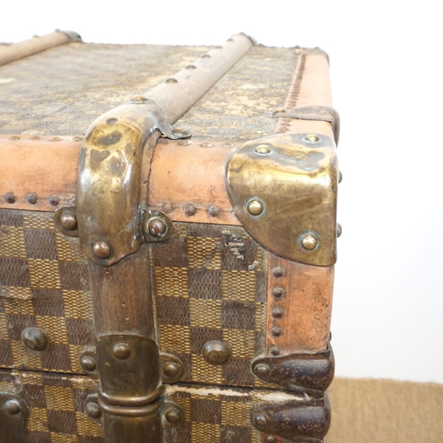 Dans le goût de Louis VUITTON : Grande malle de transport, âme en bois, toile imprimée, avant bois toilé et renfort en laiton, monogrammé sur les côtés, 60 x 91 x 54 cm (déchirures, traces, manques, en l'état).