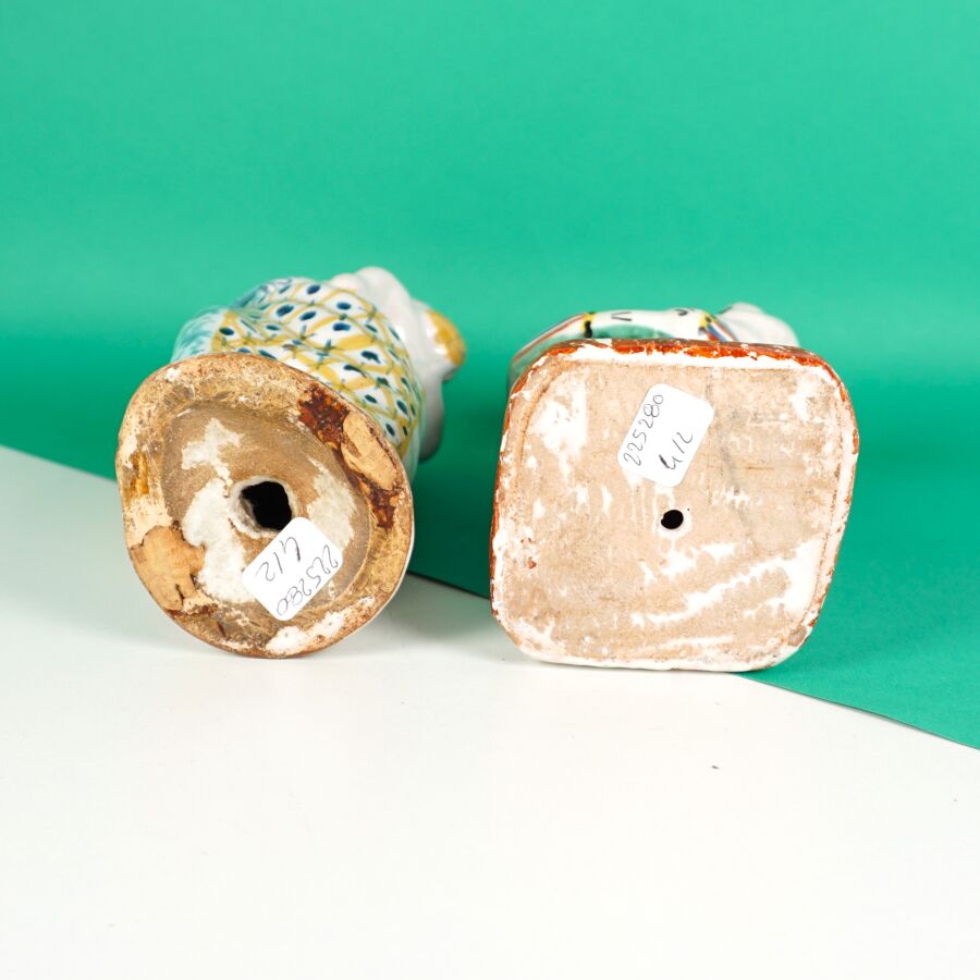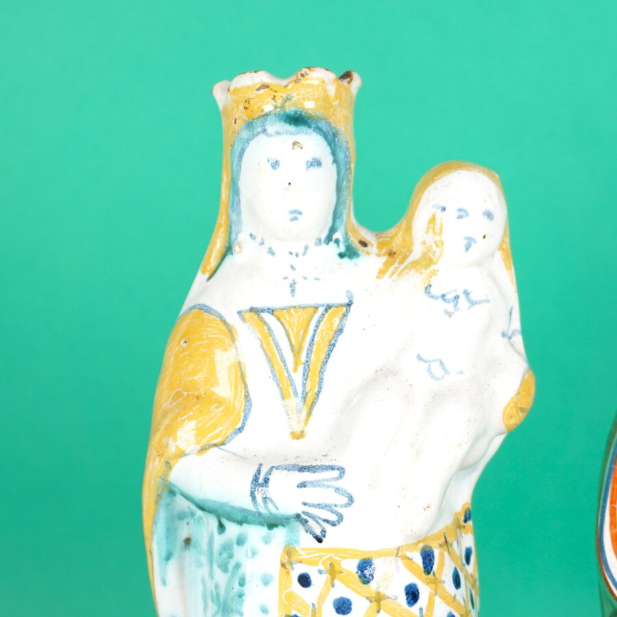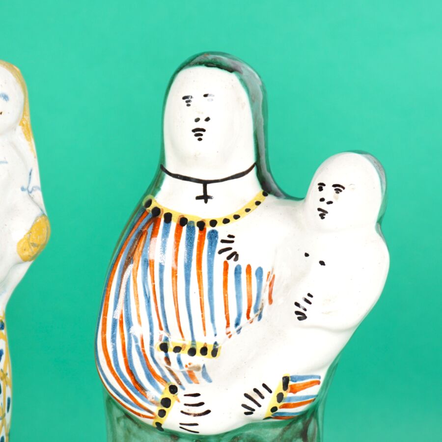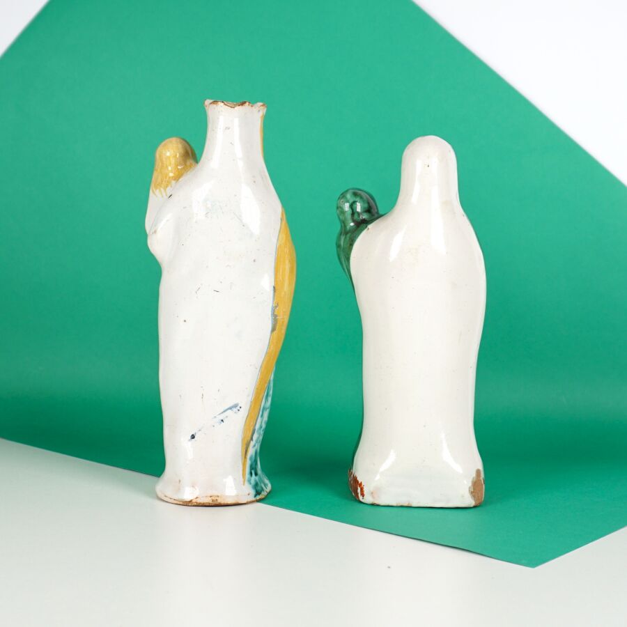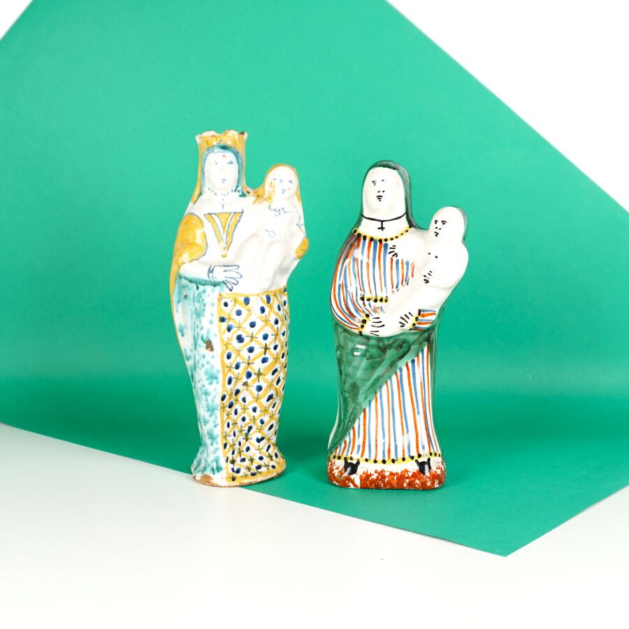 Dans le goût de MALICORNE : "Vierges à l'enfant", deux sujets en faïence émaillée polychrome, H. 23 cm et 21.5 cm (usures, éclats).