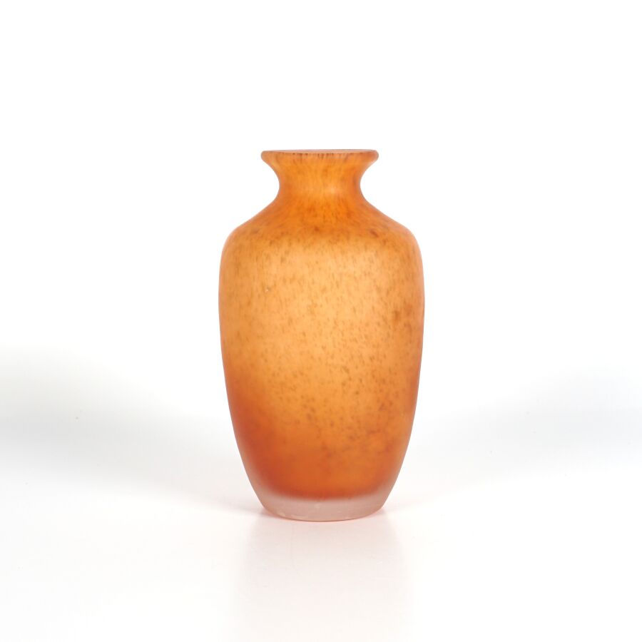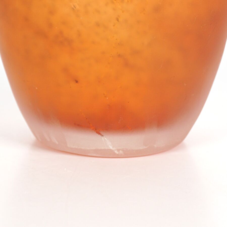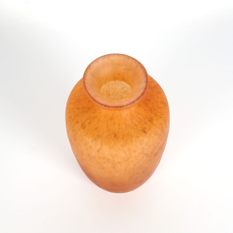 Dans le goût de MULLER : Vase en pâte de verre marmoréen orangé, H. 16 cm (rayures).