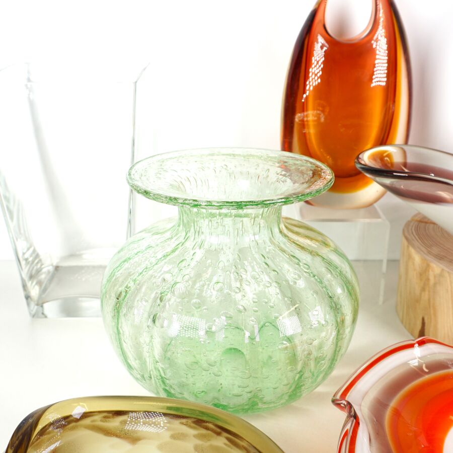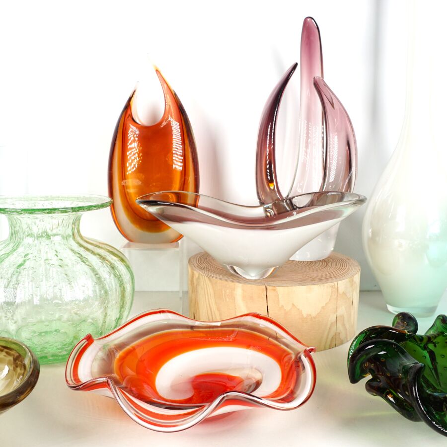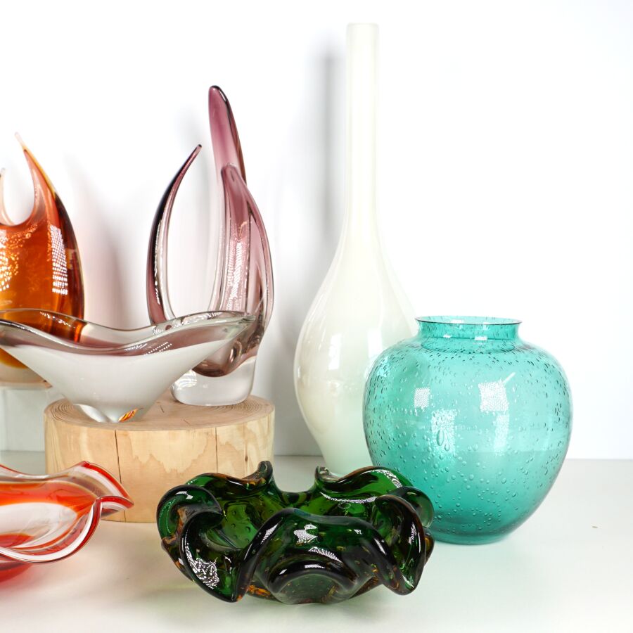 Dans le goût de MURANO : Ensemble de 10 vases et coupes en verre teinté ou incolore, dont vase boule en verre teinté turquoise et coupe de forme oblongue en verre partiellement teinté parme, H. de 7 à 40 cm.