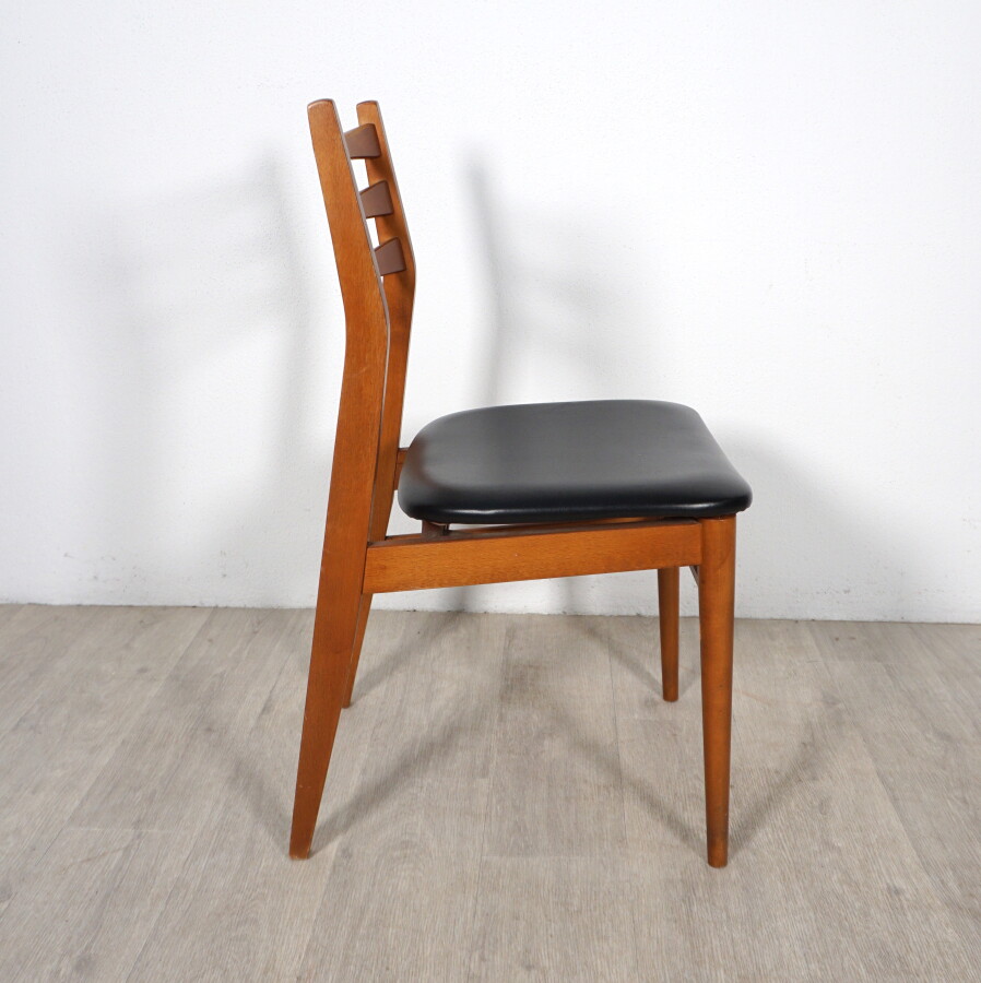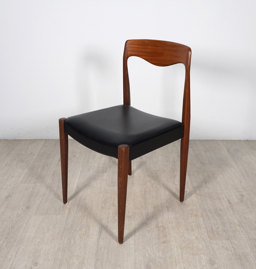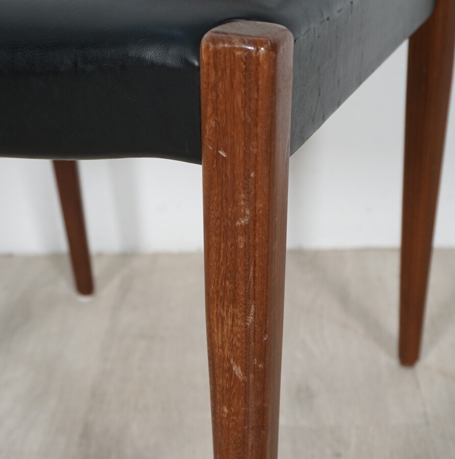 Dans le goût de Niels Otto MOLLER (1920 - 1982) : Deux chaises en bois et teck, assises en skaï noir, travail scandinave circa 1970, H.80 cm (quelques rayures et usures).