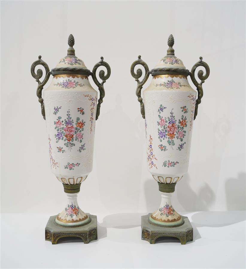 Dans le goût de SEVRES : Paire de vases couverts en porcelaine à décor émaillé polychrome de bouquets de fleurs dans des réserves, montures en métal doré, marque au-dessous, H. 37 cm.