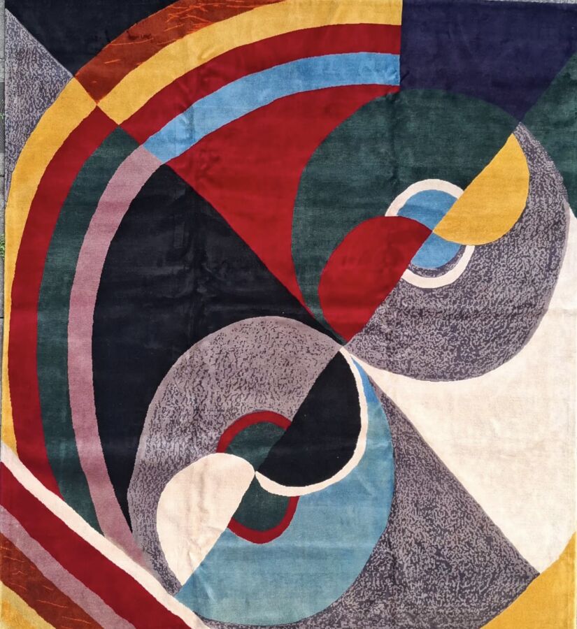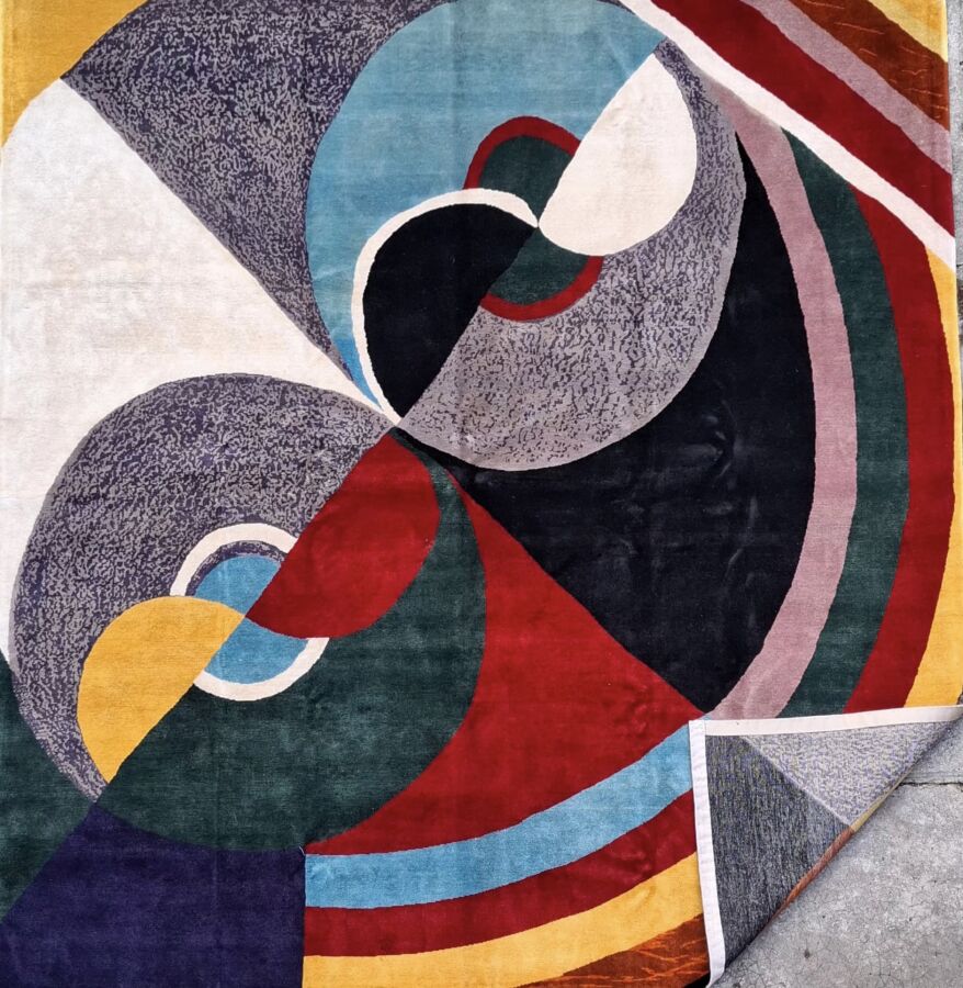 Dans le goût de Sonia DELAUNAY ( 1885 / 1979 ), "Composition aux cercles colorés", tapis-tapisserie en laine noué à la main, 252 x 277 cm.