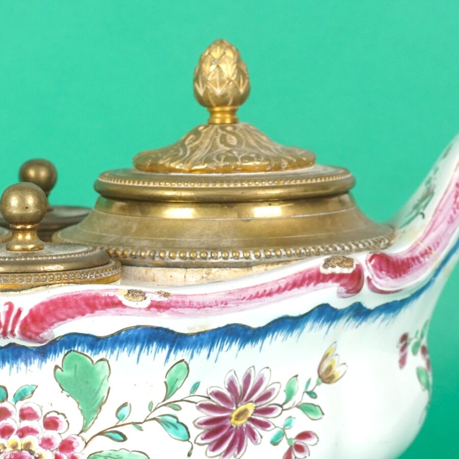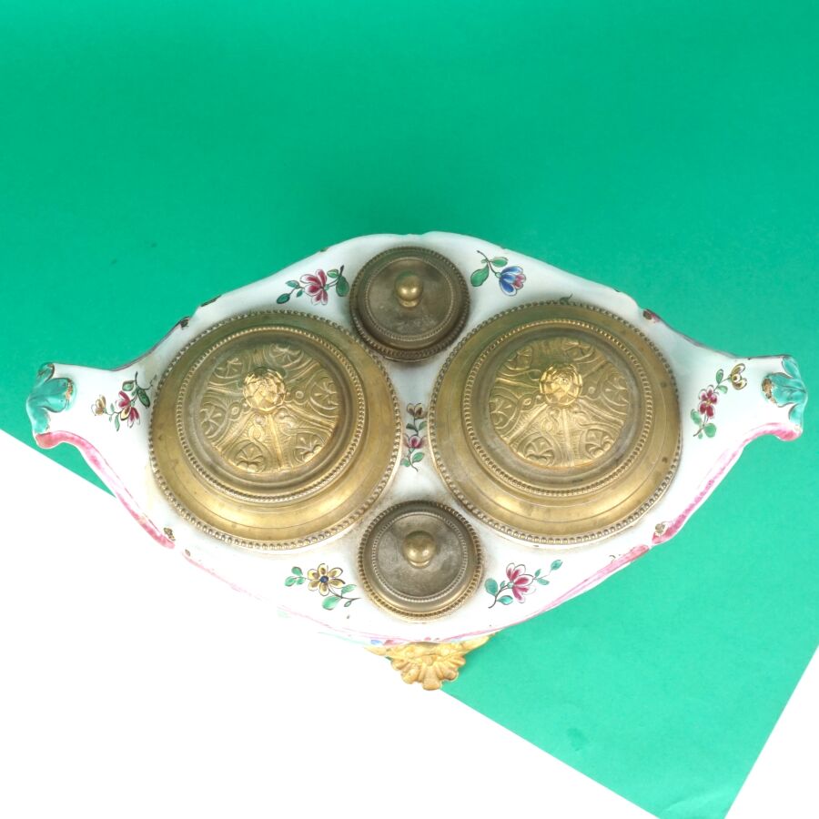 Dans le goût de STRASBOURG : Encrier en faïence émaillée polychrome à décor de pivoines, garniture en bronze ciselé, 19ème siècle, L. 25 cm (usures, éclats).