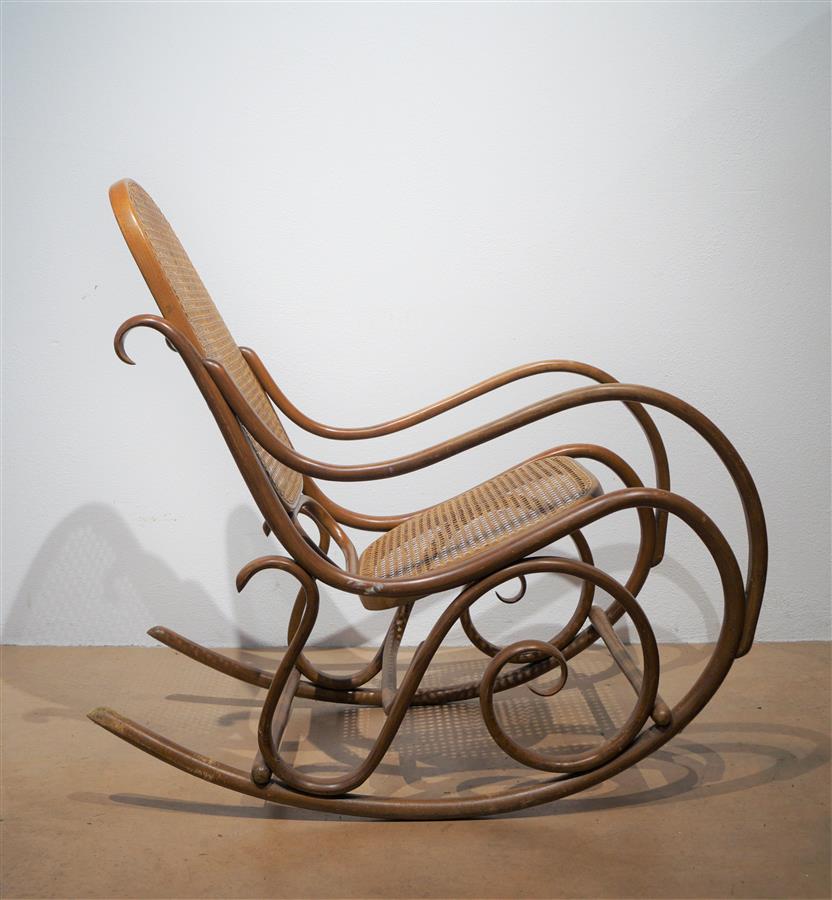 Dans le goût de THONET : Rocking-chair en bois courbé, dossier et assise cannés, accotoirs et piètement à enroulement (quelques rayures d'usage).