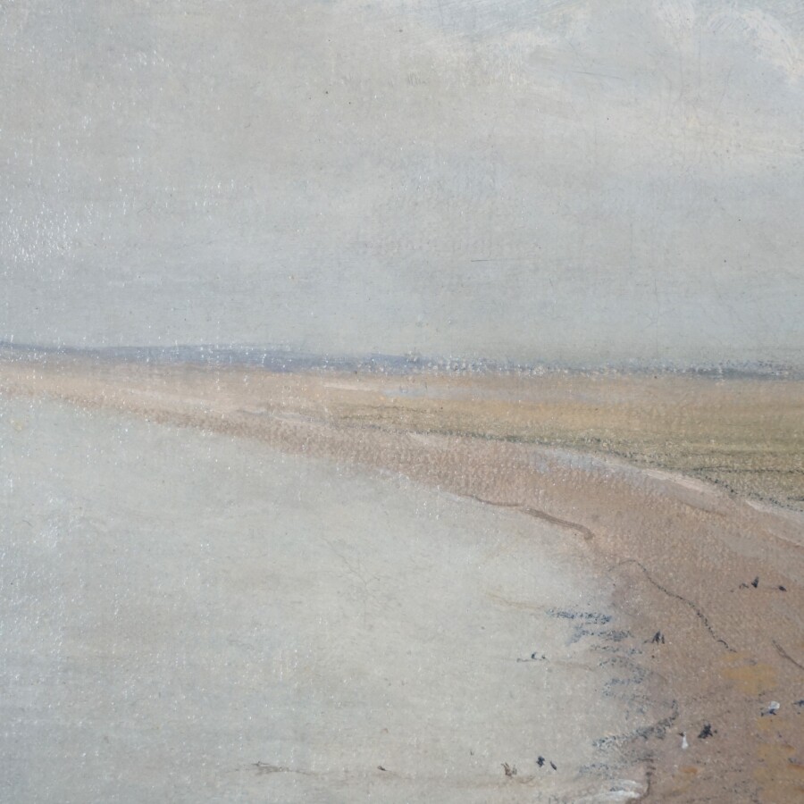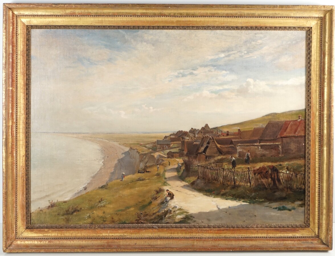 Dans le goût d'Edme-Adolphe FONTAINE (1814-1883), "Hameau animé près de la falaise, Normandie", huile sur toile, non signée, 44 x 62 cm.