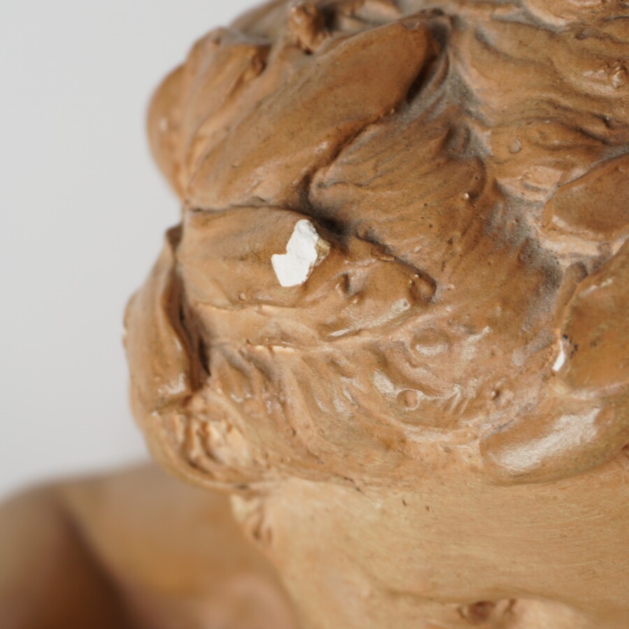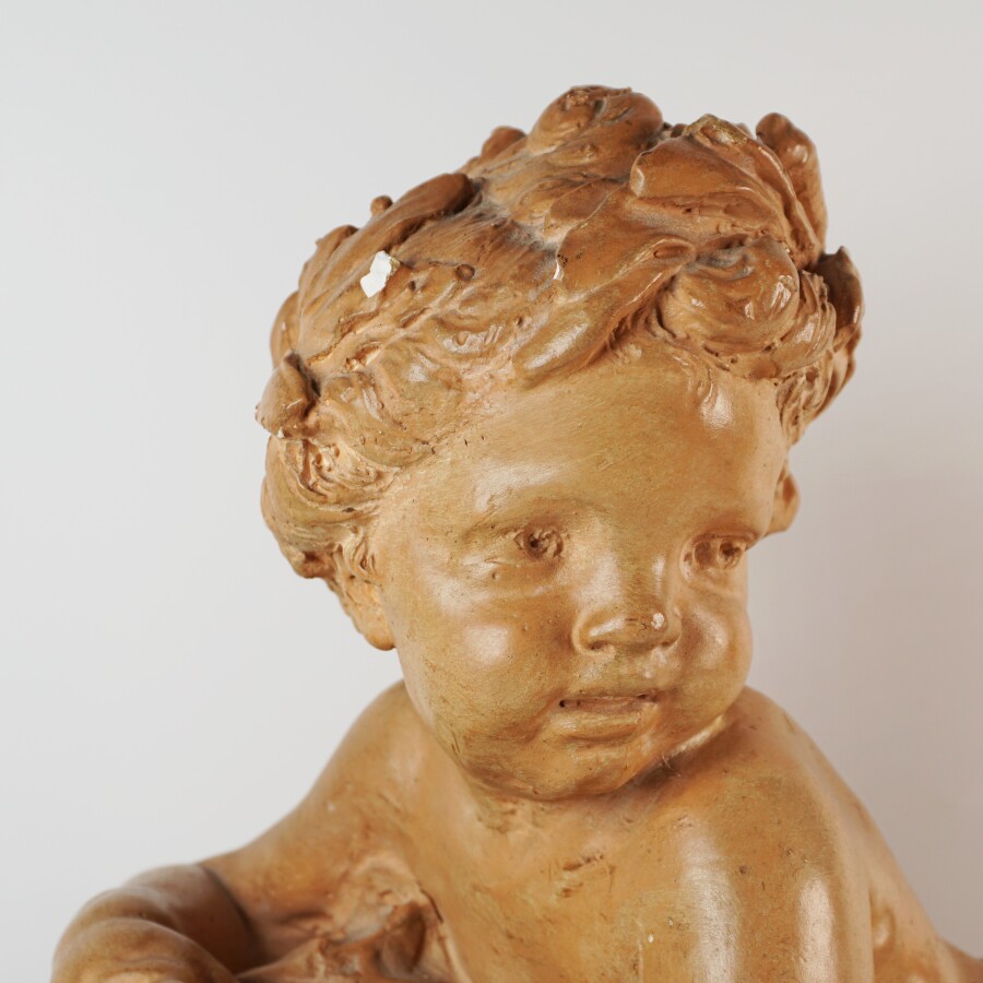 Dans le goût du 18e siècle, "Putto à la jarre d'eau", sujet en plâtre patiné à l'imitation de la terre cuite, fin du 19e siècle, L. 52 cm. H. 40 cm (quelques éclats et égrenures).