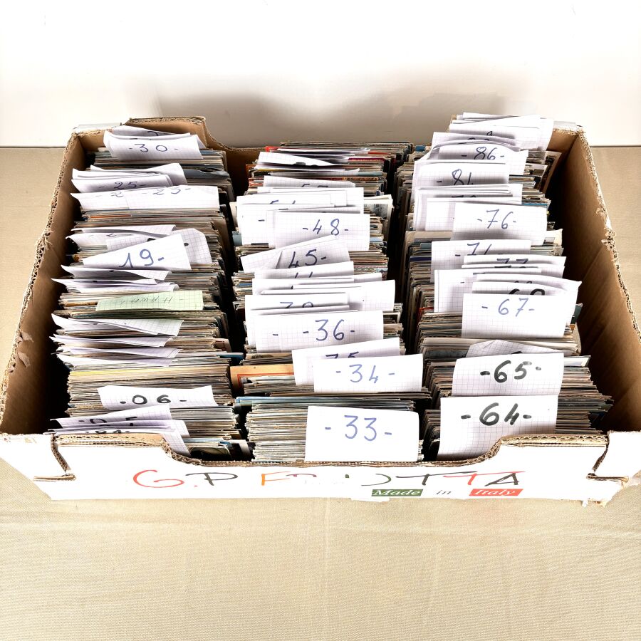 Dans une caisse, plus de 2 500 CPSM et CPM, classées par département du 01 au 95.