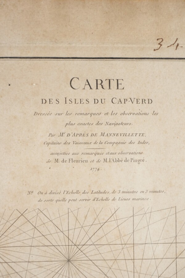 D'après DE MANNEVILLETTE (Capitaine des vaisseaux de la Compagnie des Indes), "Carte des Isles du Cap-Verd", gravure à l'eau-forte, 49 x 34 cm.