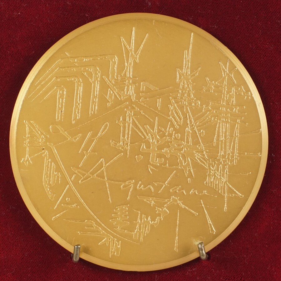D'après Georges MATHIEU (1921-2012) : Médaille circulaire en bronze doré réalisée pour la société ELF AQUITAINE, datée 1987 sur la tranche, D. 8.5 cm.