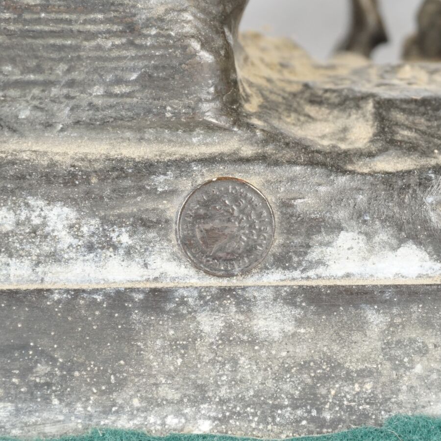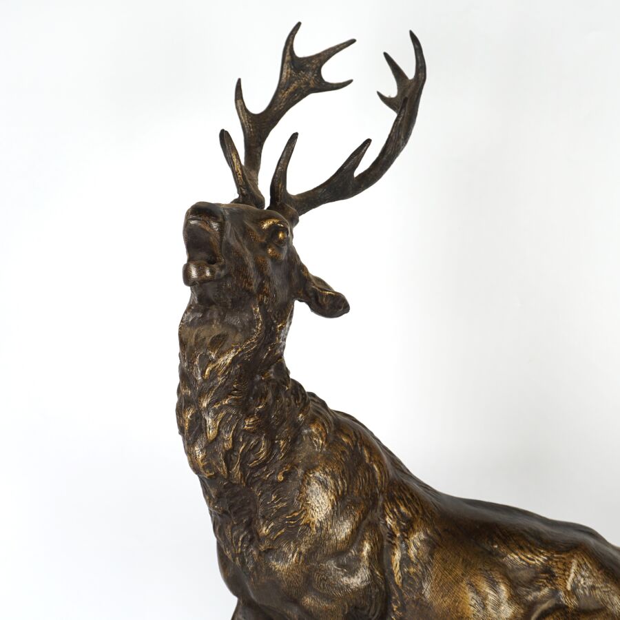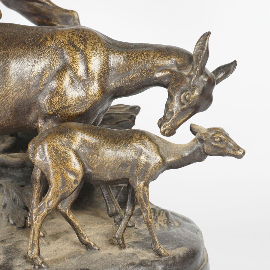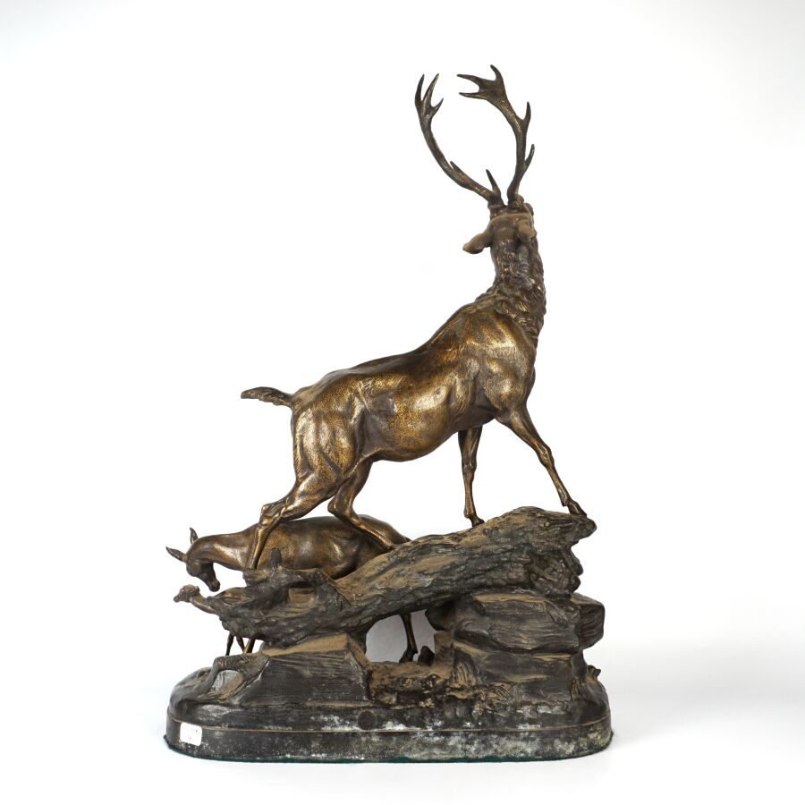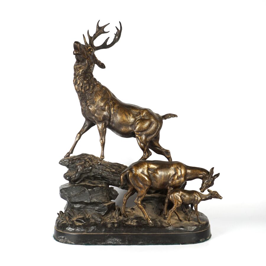 D'après Hippolyte HEIZLER (1828-1871), "Cerf, biche et leur faon", groupe en régule à patine brune, porte un cachet d'éditeur "Fabrication française / Paris / Made in France", signé, fin du 19ème siècle, H. 60 cm (une oreille du faon manquante).