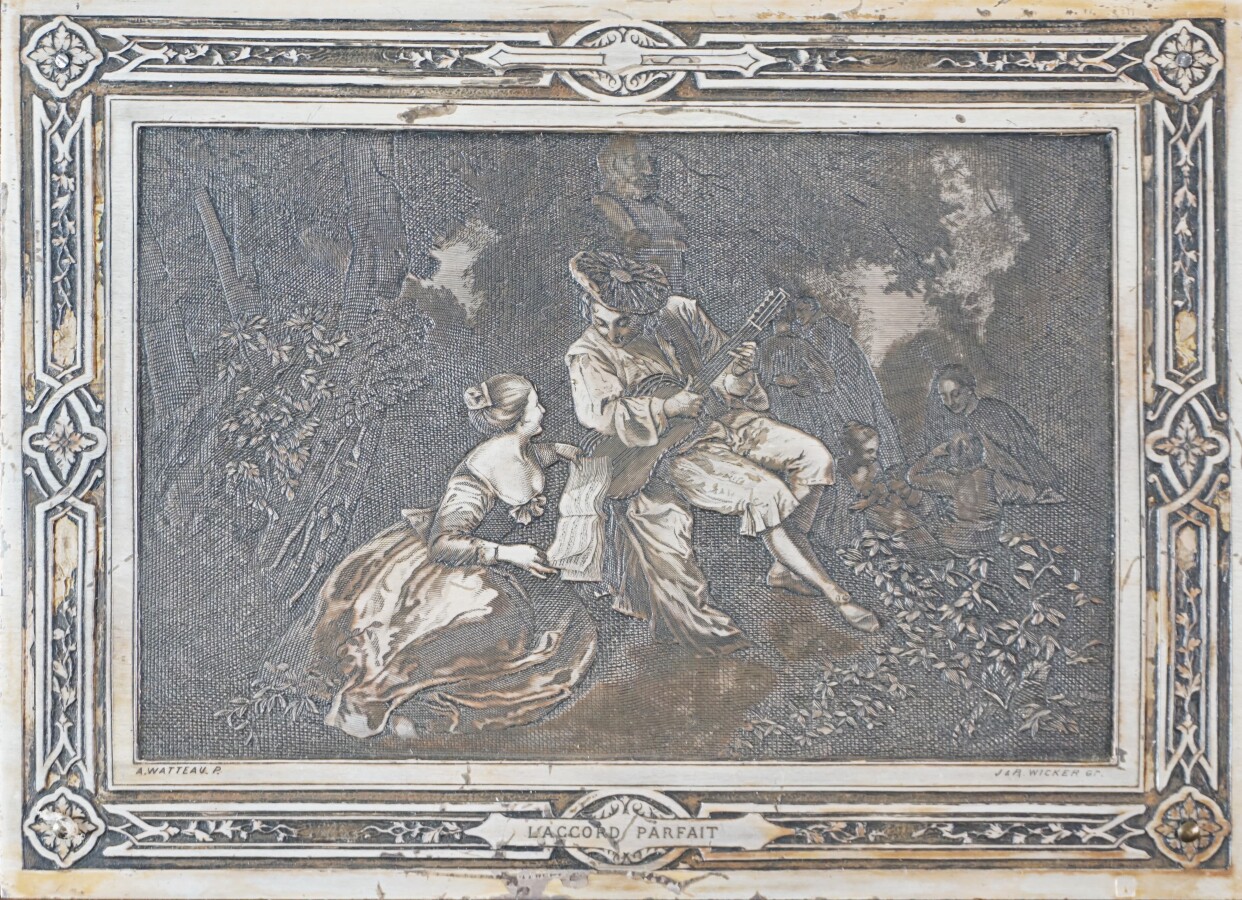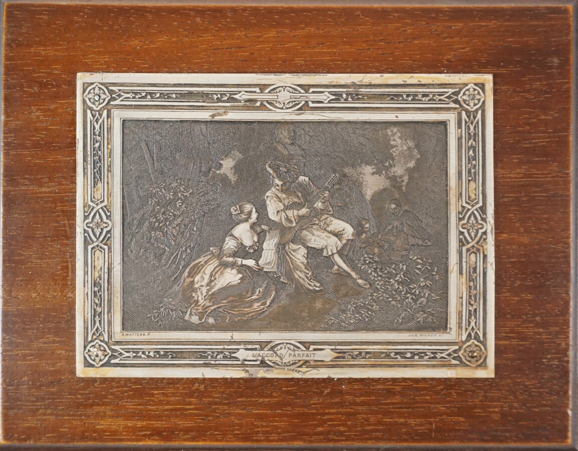 D'après Jean-Antoine Watteau (1684-1721), "L'Accord parfait", plaque gravée sur panneau de bois, signée en creux en bas à gauche, titrée dans un cartouche au centre, gravée par "J&R Wicker", 11 x 15 cm (oxydations, usures).