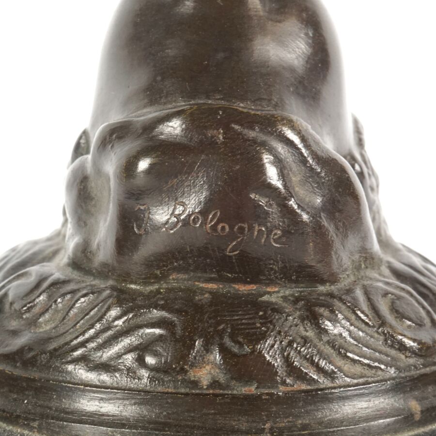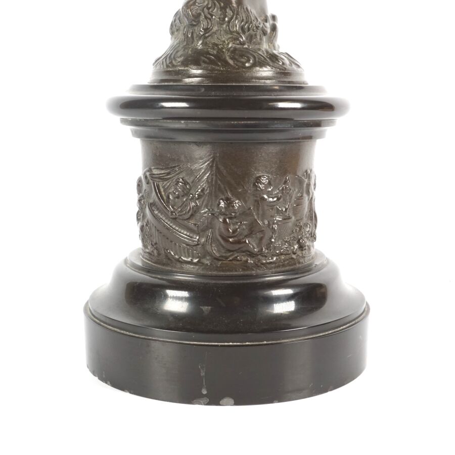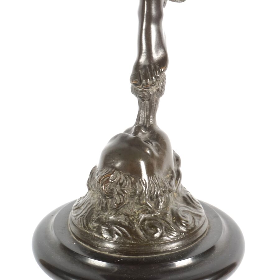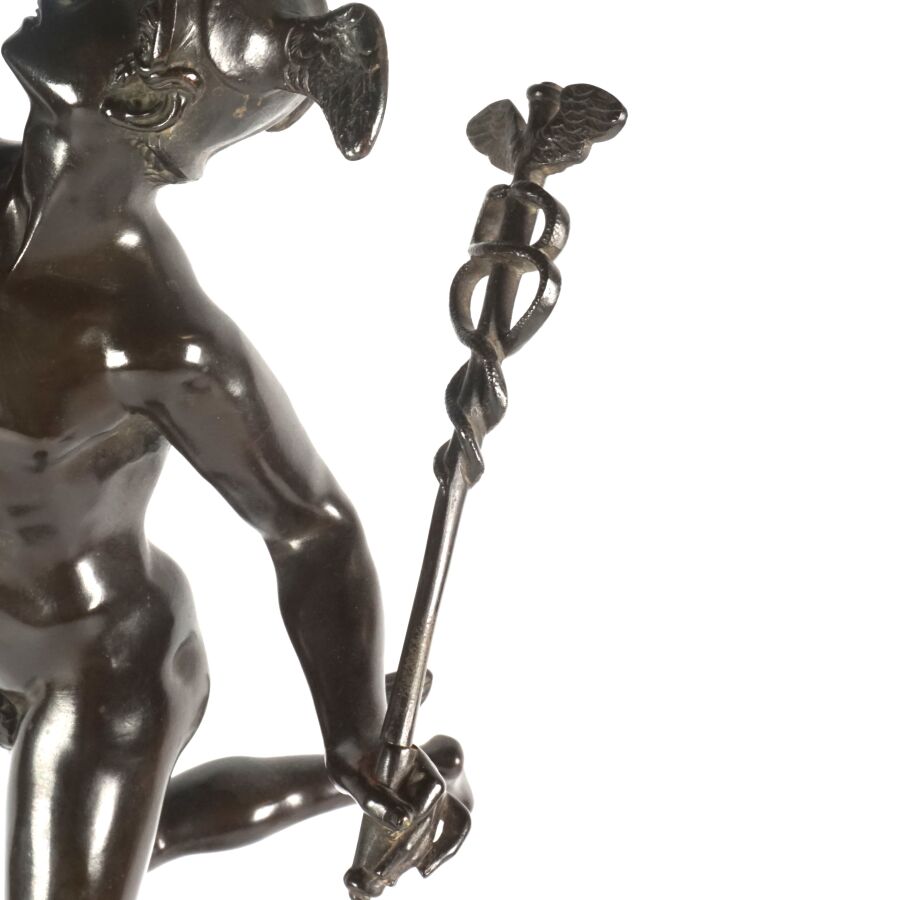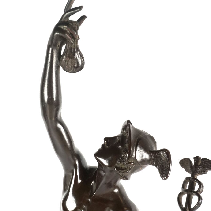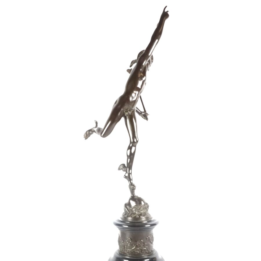 D'après Jean de BOLOGNE (1529-1608), "Hermès volant", sculpture en bronze à patine brune, signée en creux, présentée sur un socle circulaire à motif d'une colonne en marbre noir, ornée en son centre d'une frise en bas-relief, H. Totale : 82 cm.