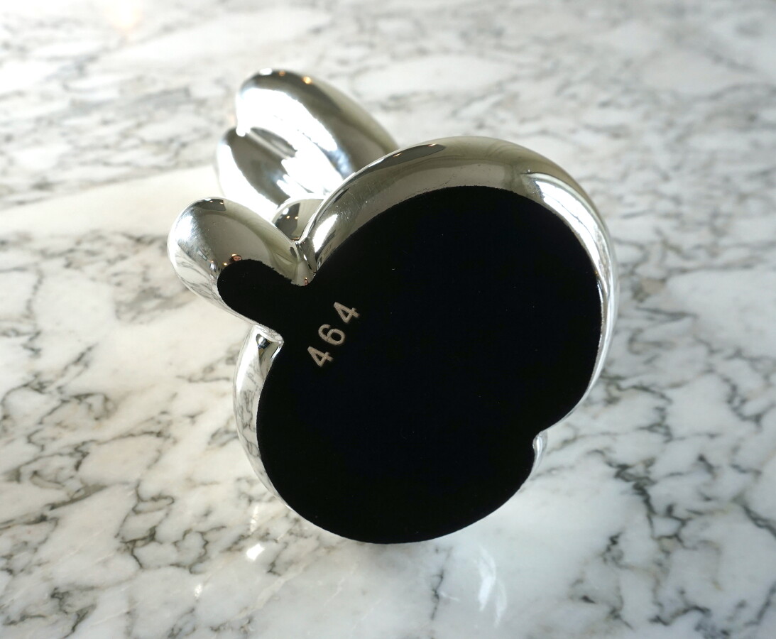D'après Jeff KOONS (1955), "Sitting Rabbit Silver", sujet en résine argentée coulée à froid, numéroté 464/999, 5 x 14 x 13,5 x H. 25 cm (très bon état).