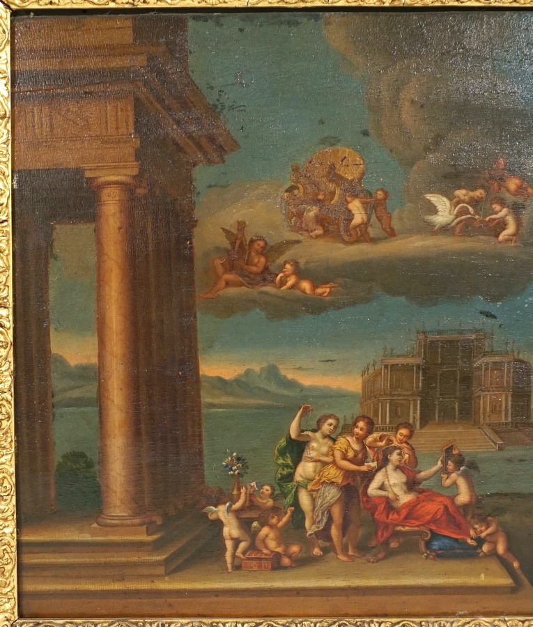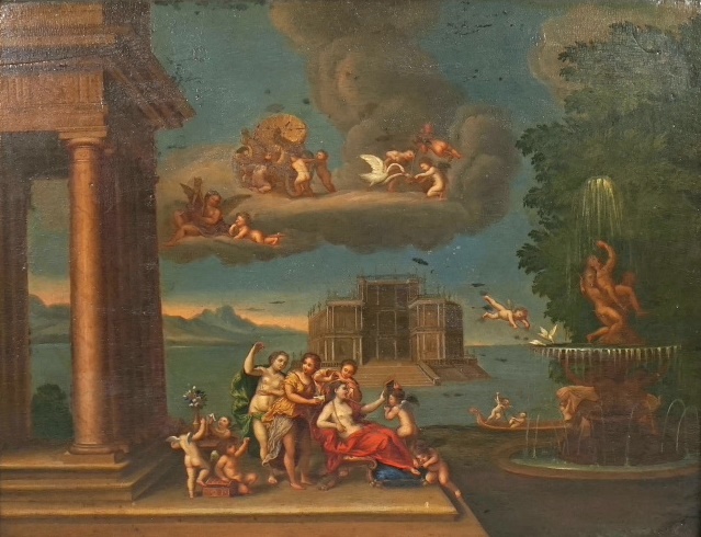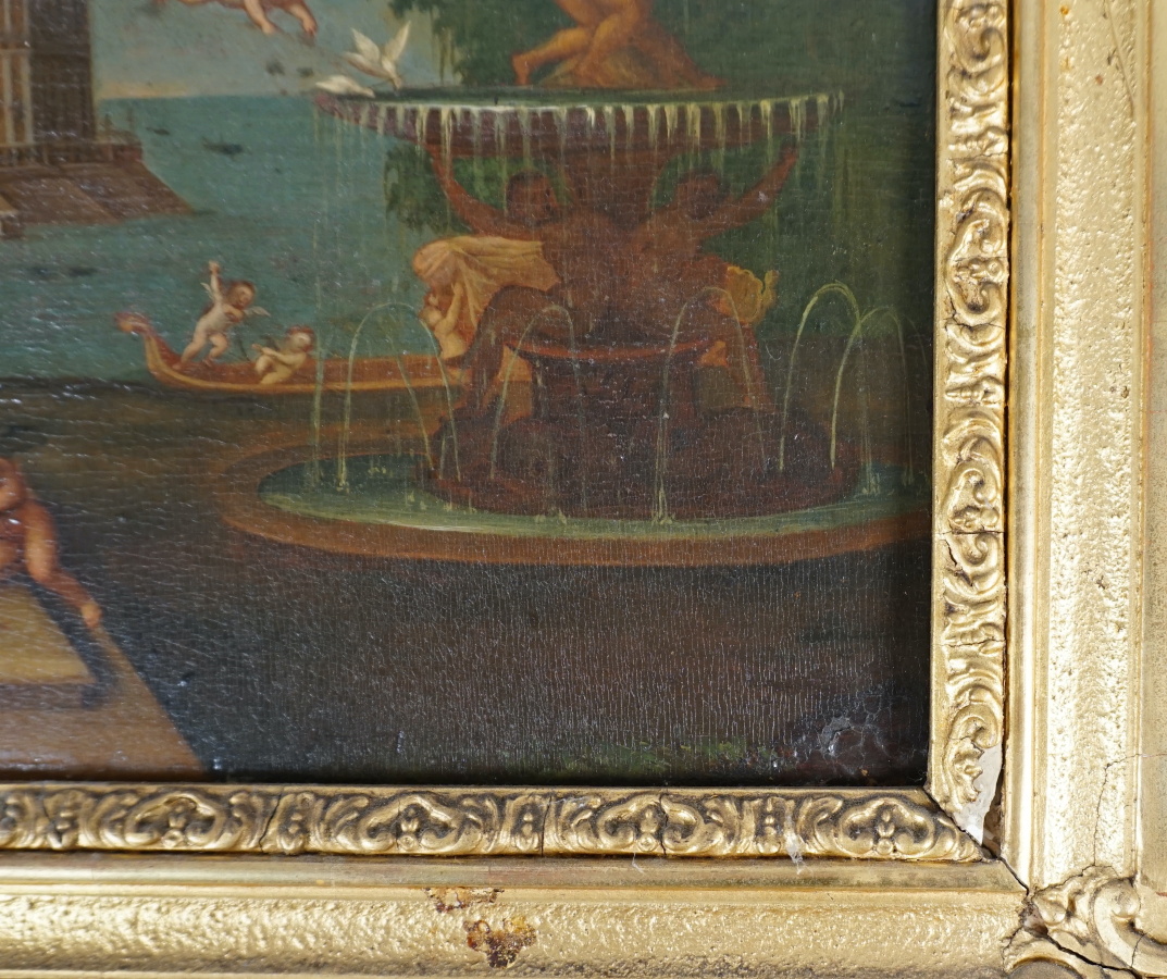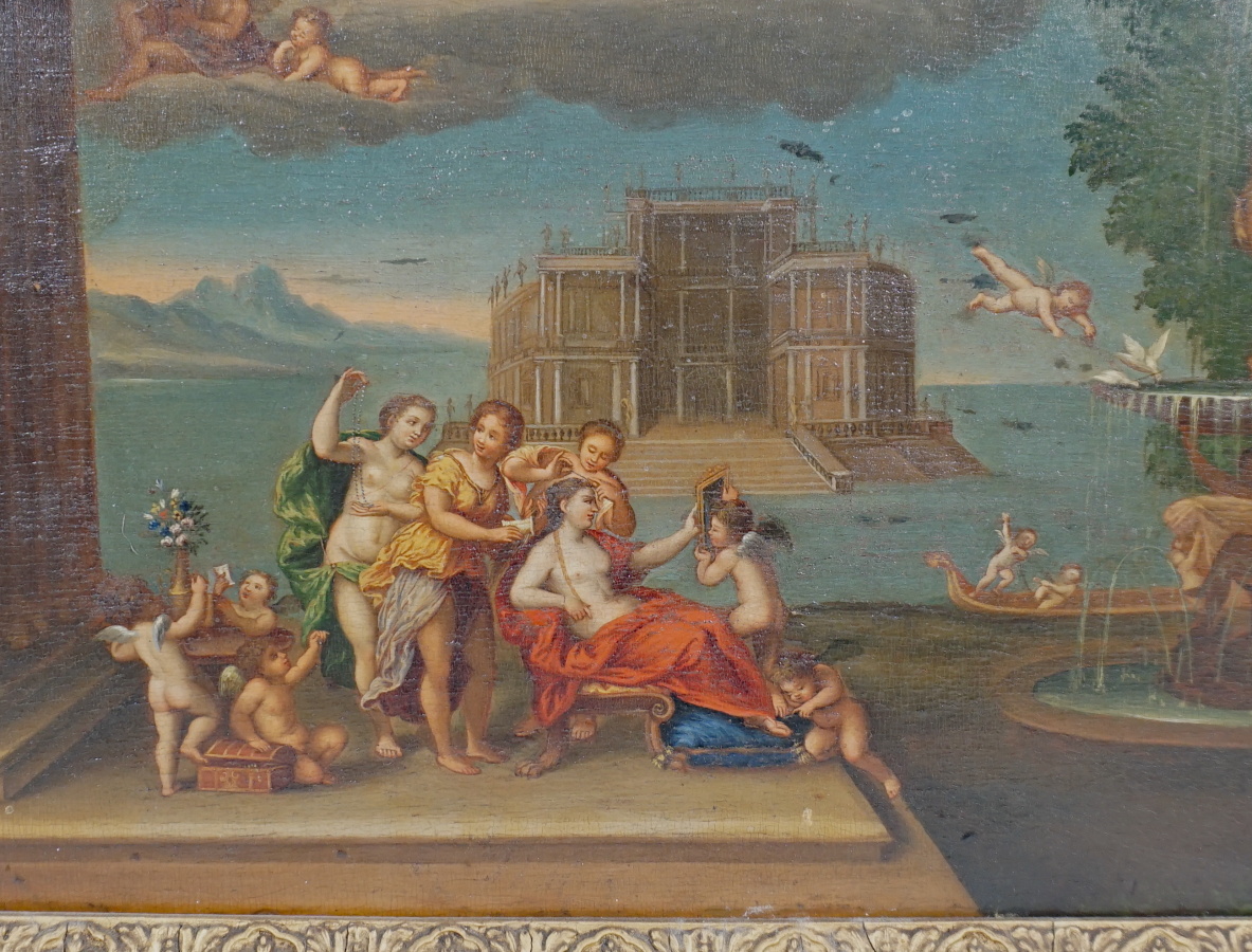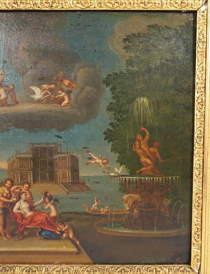 D'après L'Albane, Ecole française de la fin du 17e siècle, "Scène mythologique", huile sur panneau, 30 x 41 cm (restaurations).