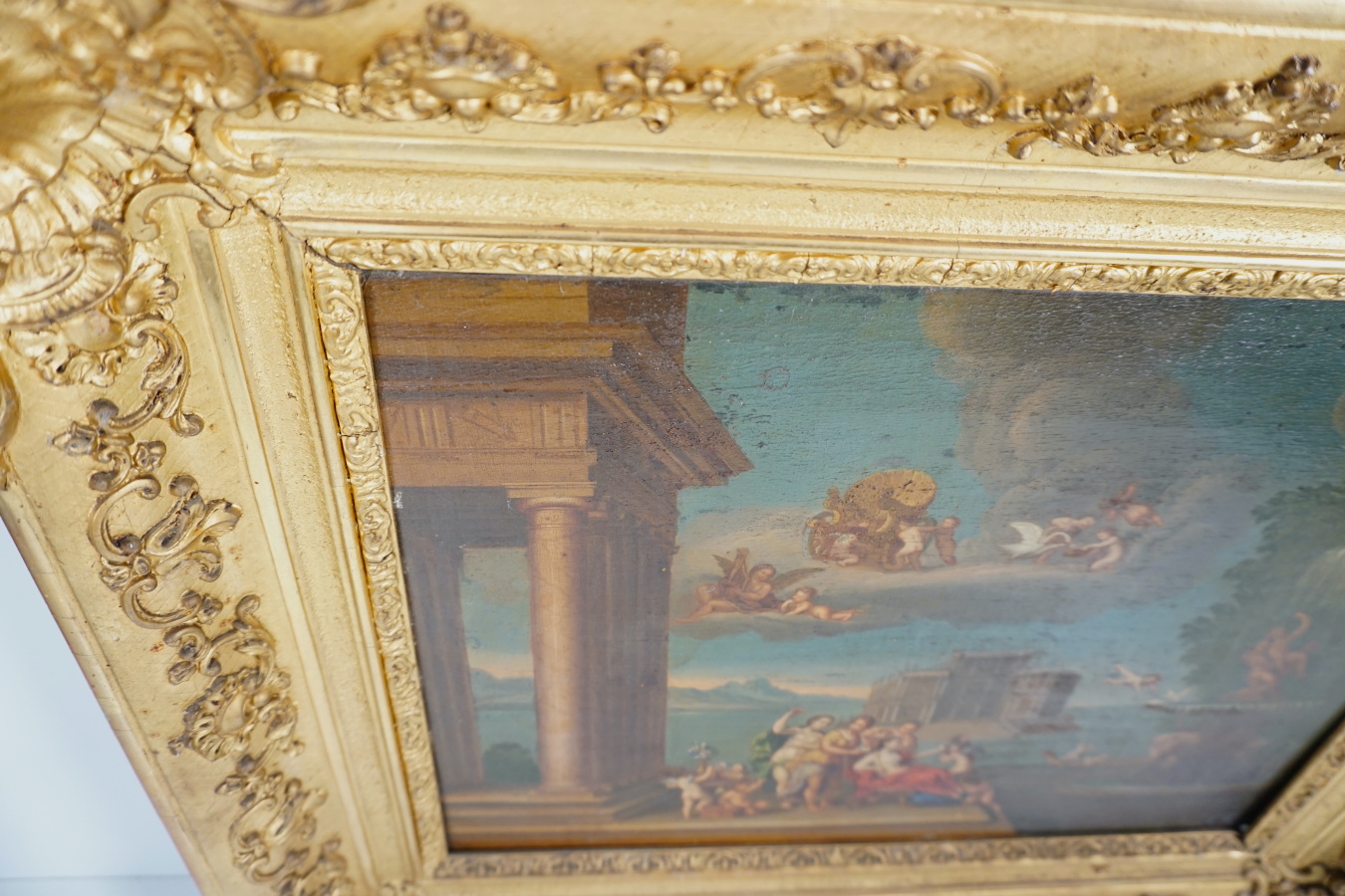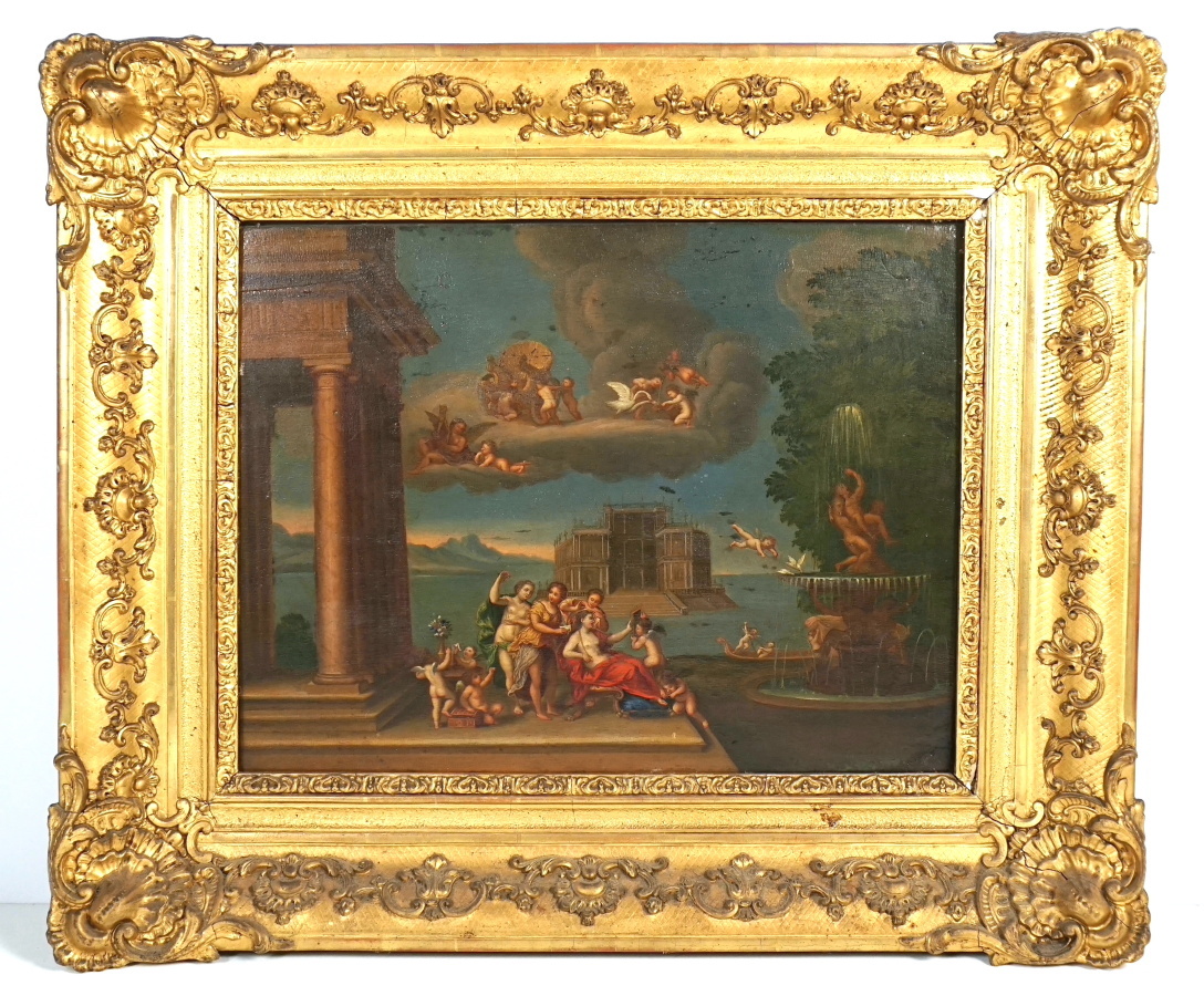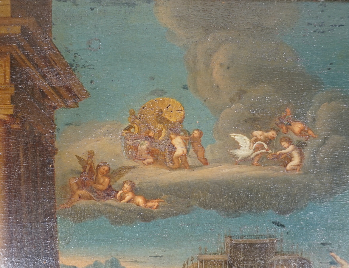 D'après L'Albane, Ecole française de la fin du 17e siècle, "Scène mythologique", huile sur panneau, 30 x 41 cm (restaurations).