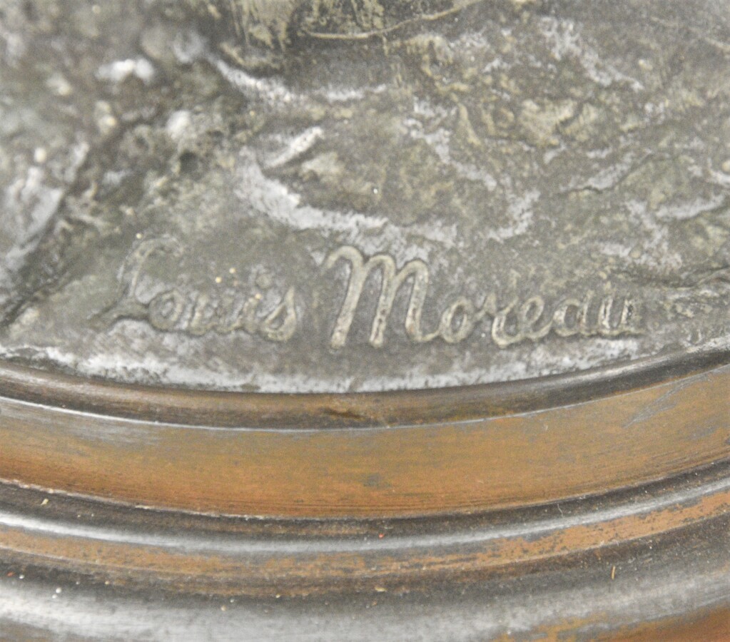 D'après Louis Auguste MOREAU (1855-1919), "En vedette", sujet en régule à patine brune, porte une signature sur la terrasse, H. 65 cm (manque la torche, accident au bec de l'oiseau, petit trou à l'arrière).