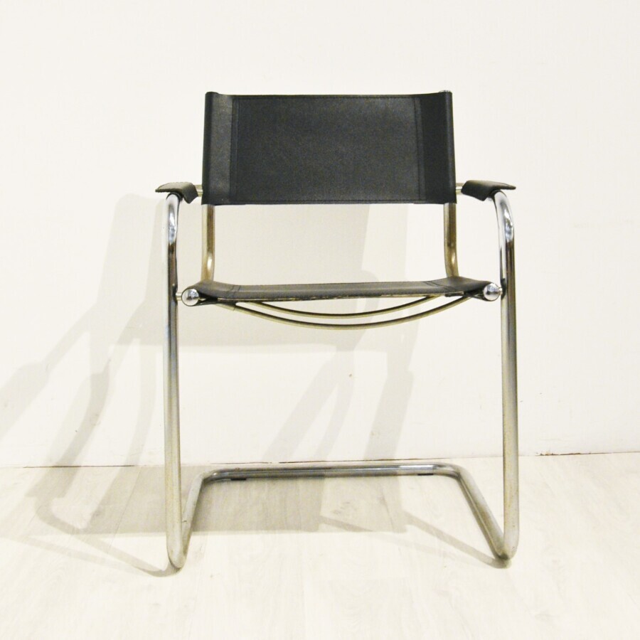 D'après Marcel BREUER (1902-1981) : Suite de 6 fauteuils modèle B34, structure tubulaire en métal chromé, assise, dossier et manchettes d'accotoirs en cuir noir surpiqué, numéro sous les accotoirs, étiquettes "E.A Controlled" sous les assises, 53 x 55 x H. 76 cm (usures au métal et usures d'usage au cuir).