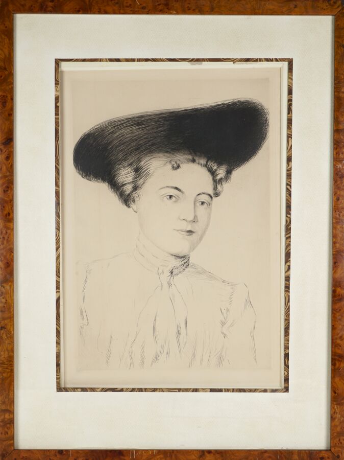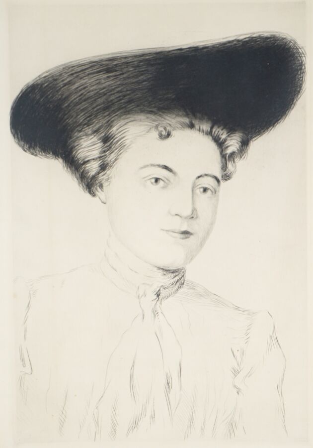 D'après Paul César HELLEU (1859-1927), "Jeune femme au chapeau", gravure non signée, 39 x 27 cm (à vue) (cadre à refixer).