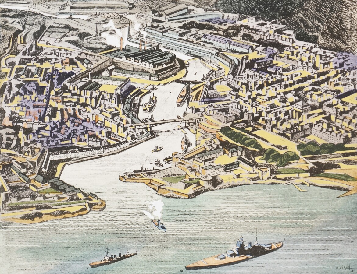 D'après Pierre PERON (1905-1988) - Peintre de la Marine, "Brest 1946", estampe et rehauts de gouache, signature estampée en bas à droite, 25 x 32.5 cm.