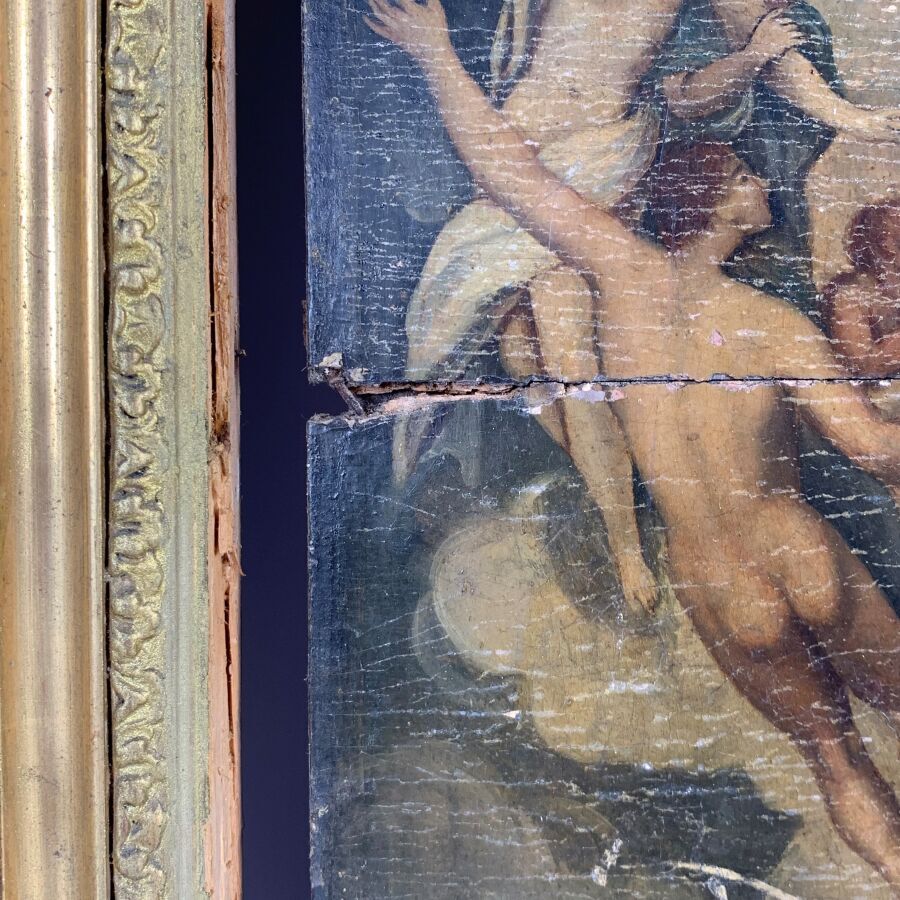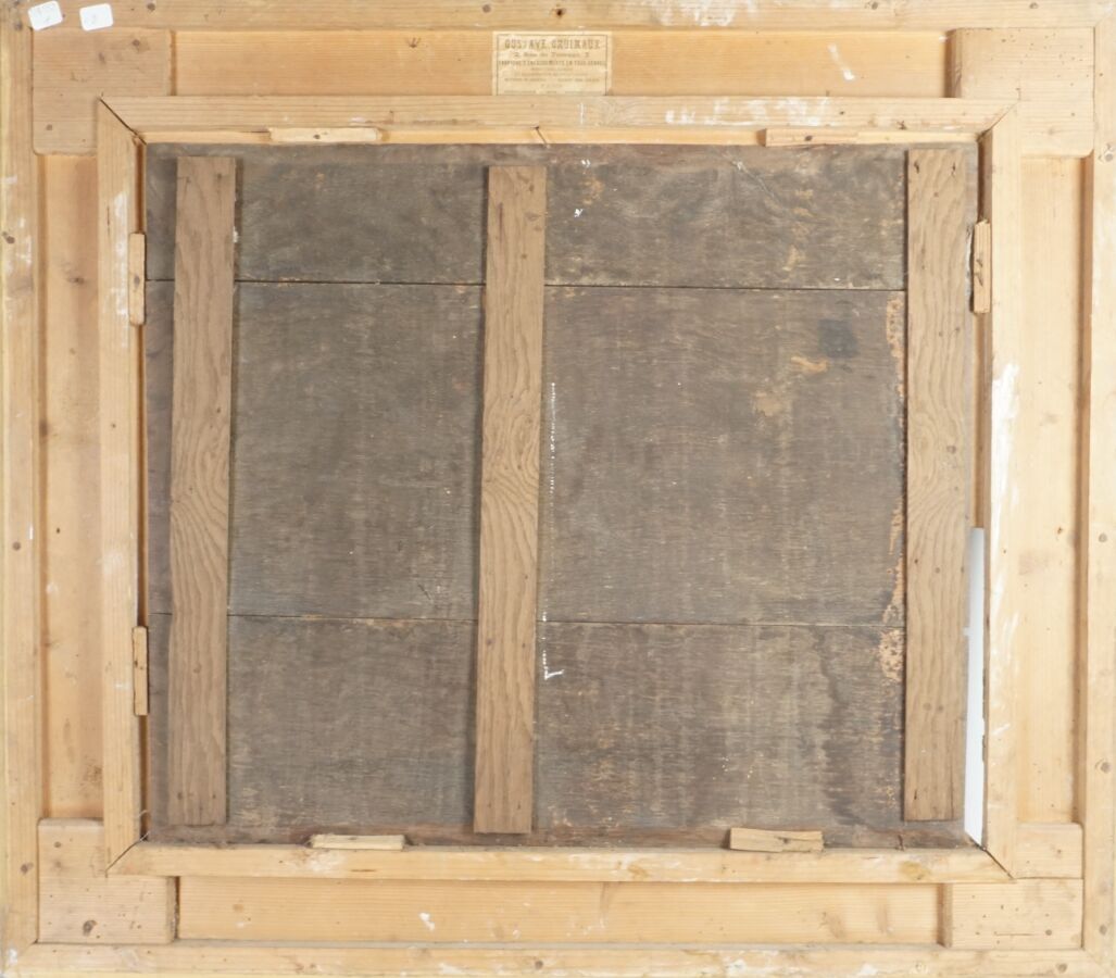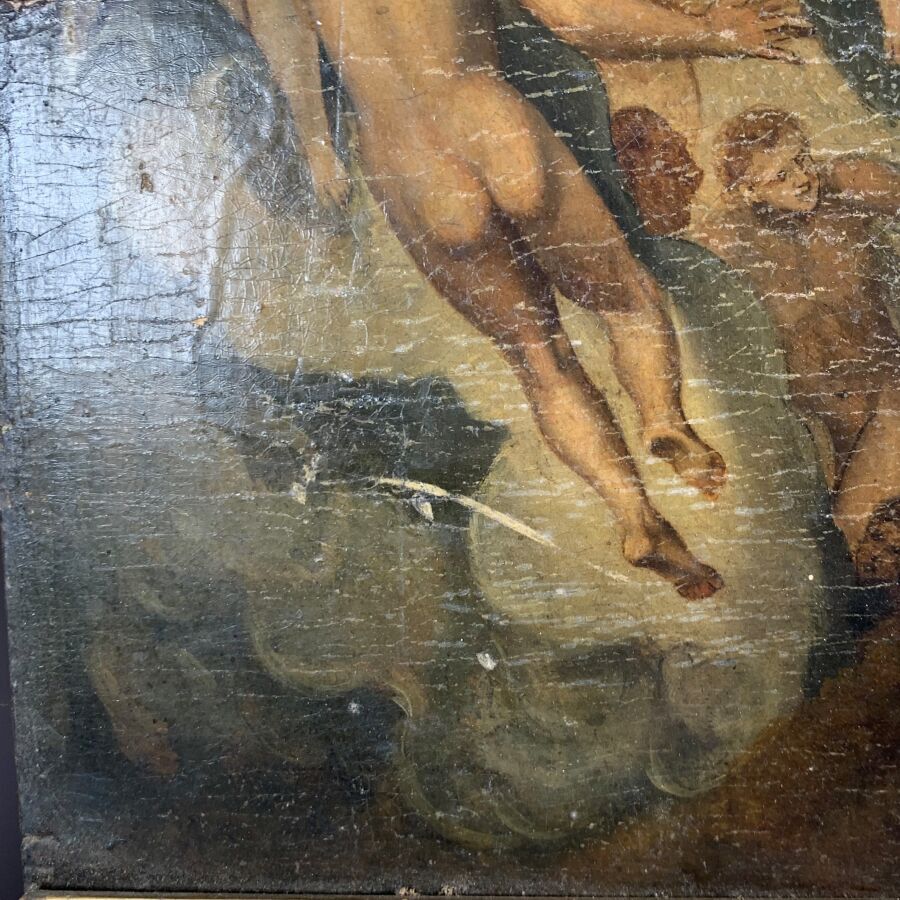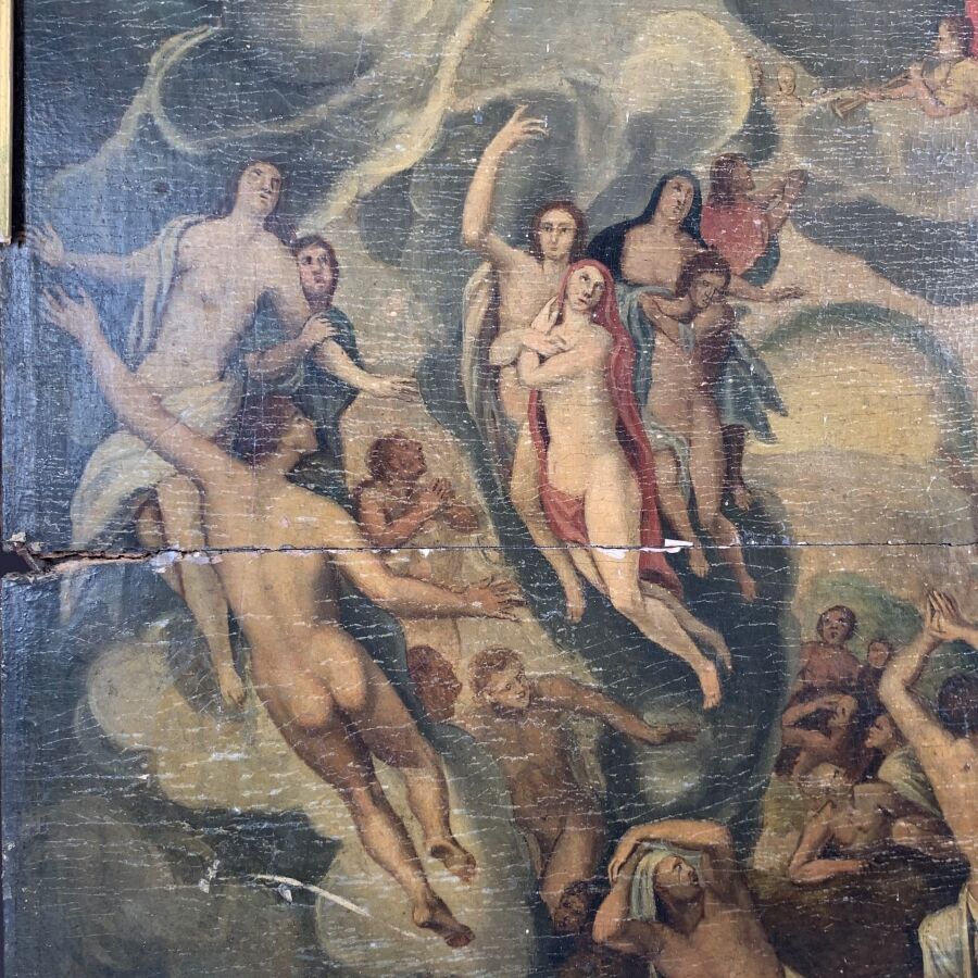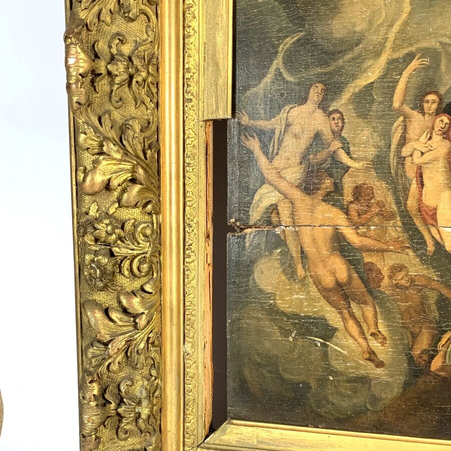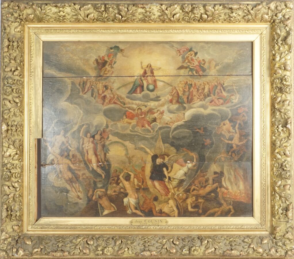 D'après SCHWARTZ, "Jugement dernier", huile sur panneau non signée, copie ancienne, 51 x 57 cm (fentes, usures et craquelures).