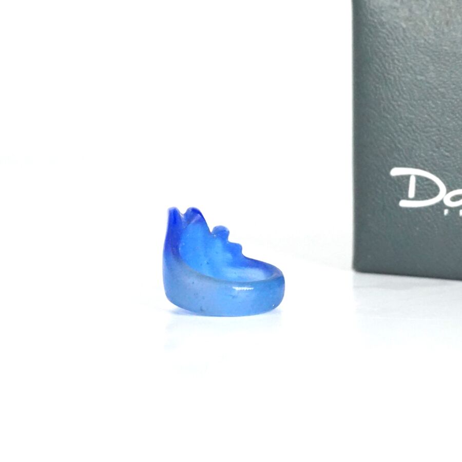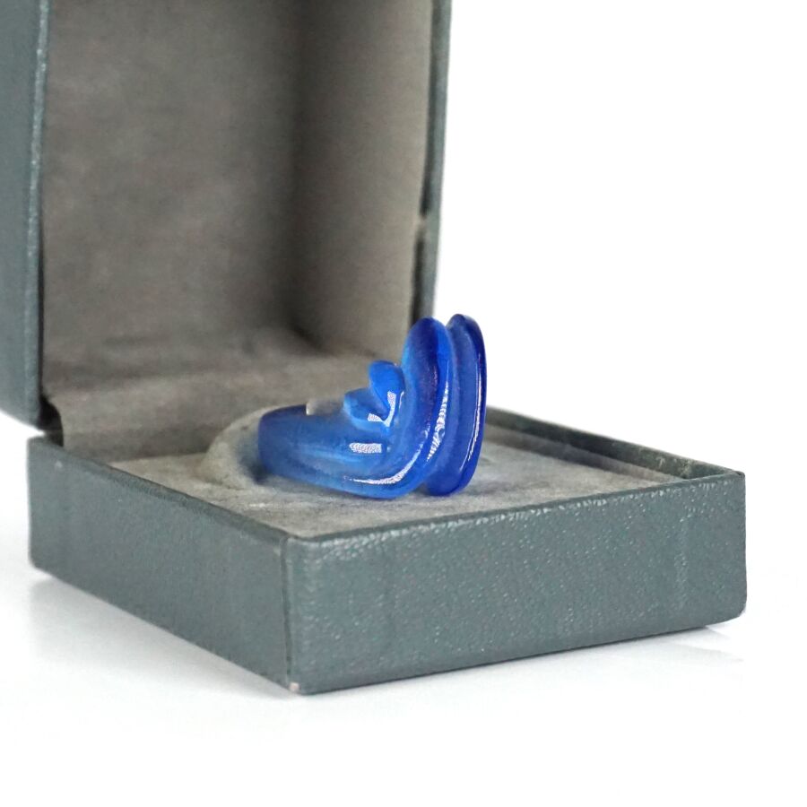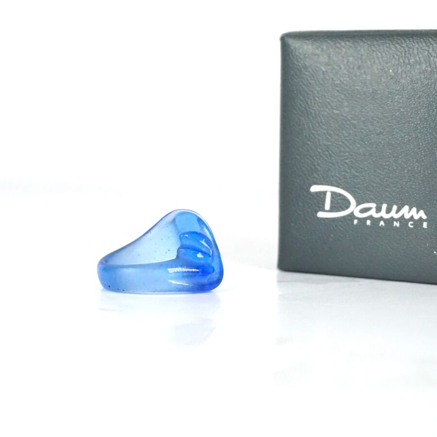 DAUM : Bague "Nymphéa" en pâte de verre teinté bleu, non signée, présentée dans sa boîte, TDD. 54.5. Larg. 1.9 cm (petites égrenures).