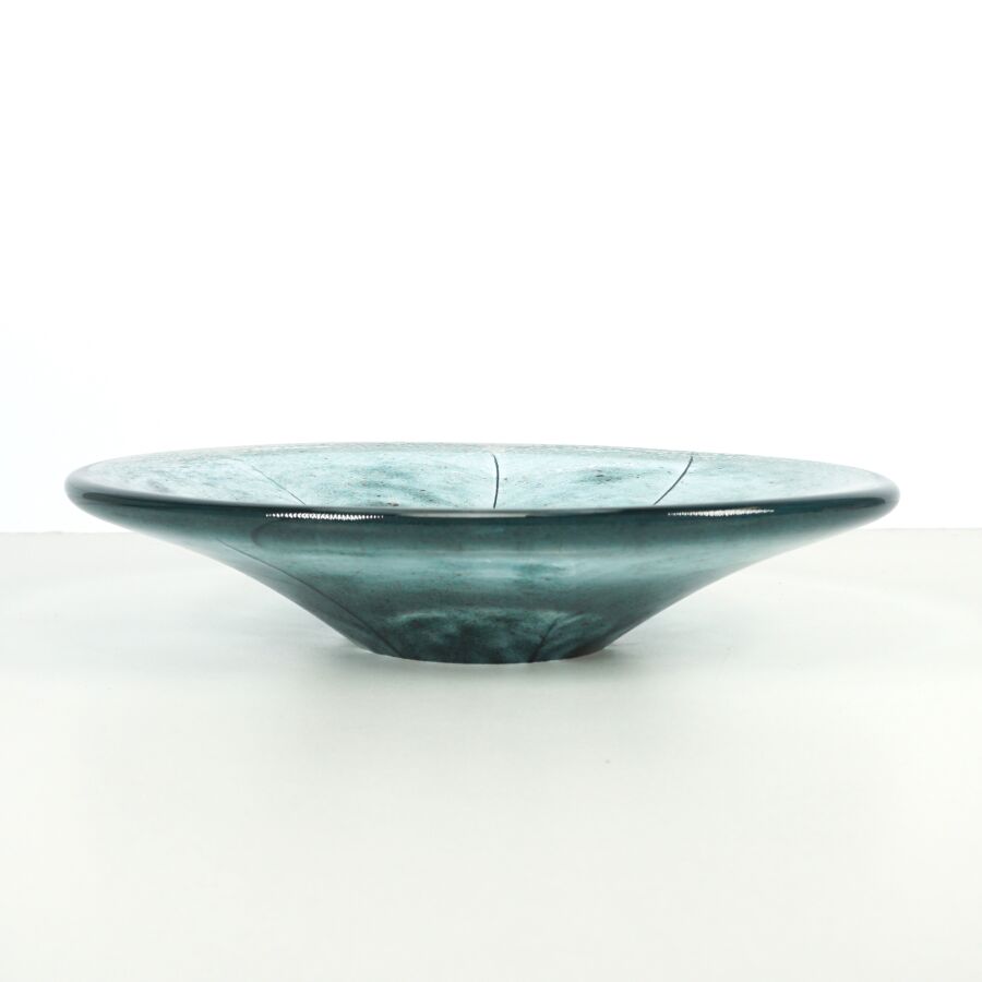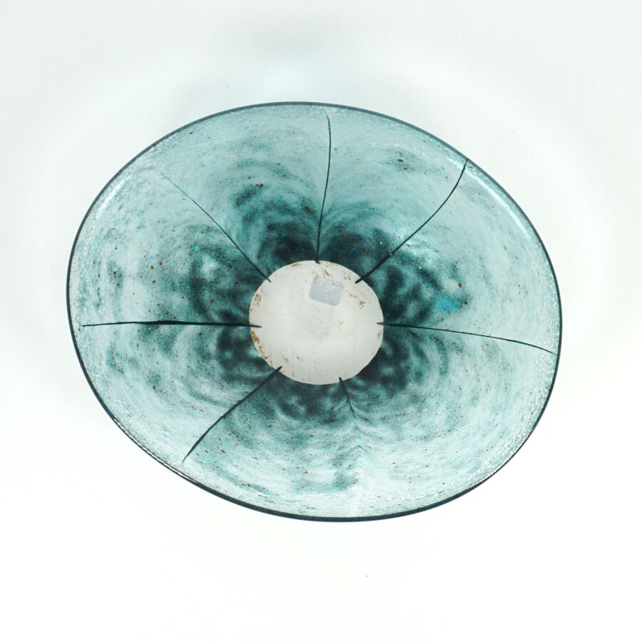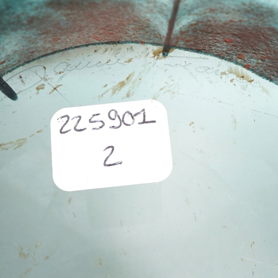 DAUM FRANCE : Coupe plate de forme ovale en verre teinté turquoise tacheté de rouge, signé sous la base, L. 30 cm.
