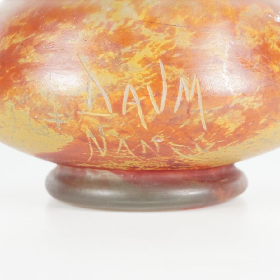 DAUM NANCY : Coupe en verre soufflé marmoréen rouge-orangé, signé à la pointe, H. 9 cm.